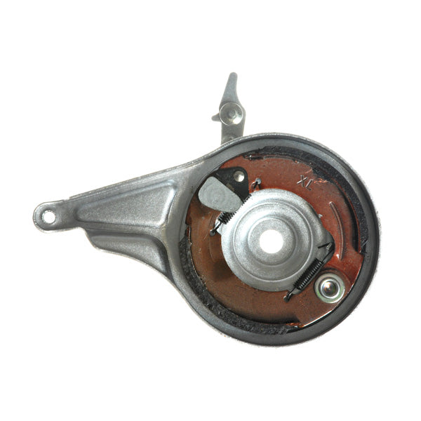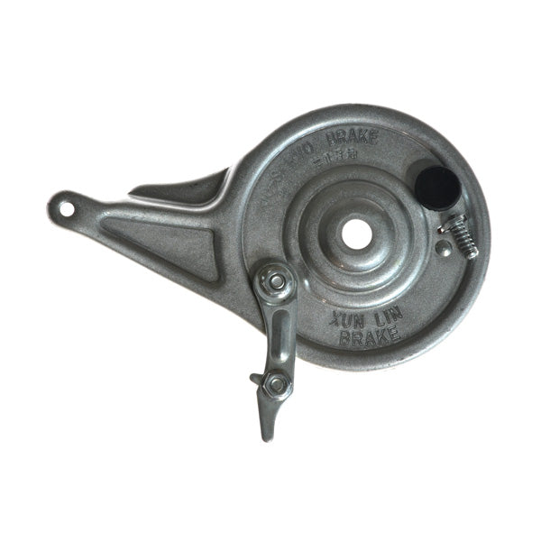 We call this our "100 mm Internal Expanding Rear Brake Drum Assembly" Here is a curious little item, an internal expansion drum brake assembly. Unlike some small scooter brake units that use bands that contract or clamp-down on a spinning drum to provide the braking pressure, this brake unit's shoes expand outwards to grip the inside of the drum. This is essentially the same system used on an automotive drum brake, but on a much smaller scale.
