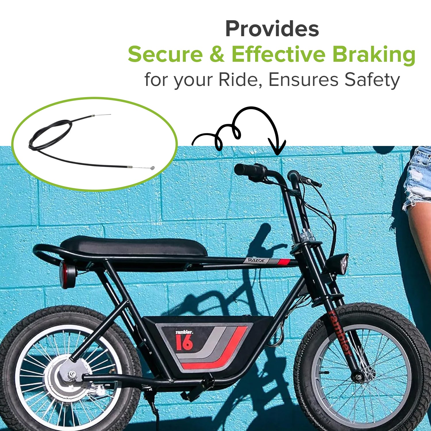 Our 52" brake cable for the Razor Rambler 16 electric mini bike Is a fast and easy replacement for a damaged cable on your Razor. This cable has a barrel end that fits onto the brake lever, and a bare end that is clamped onto the drum brake assembly.