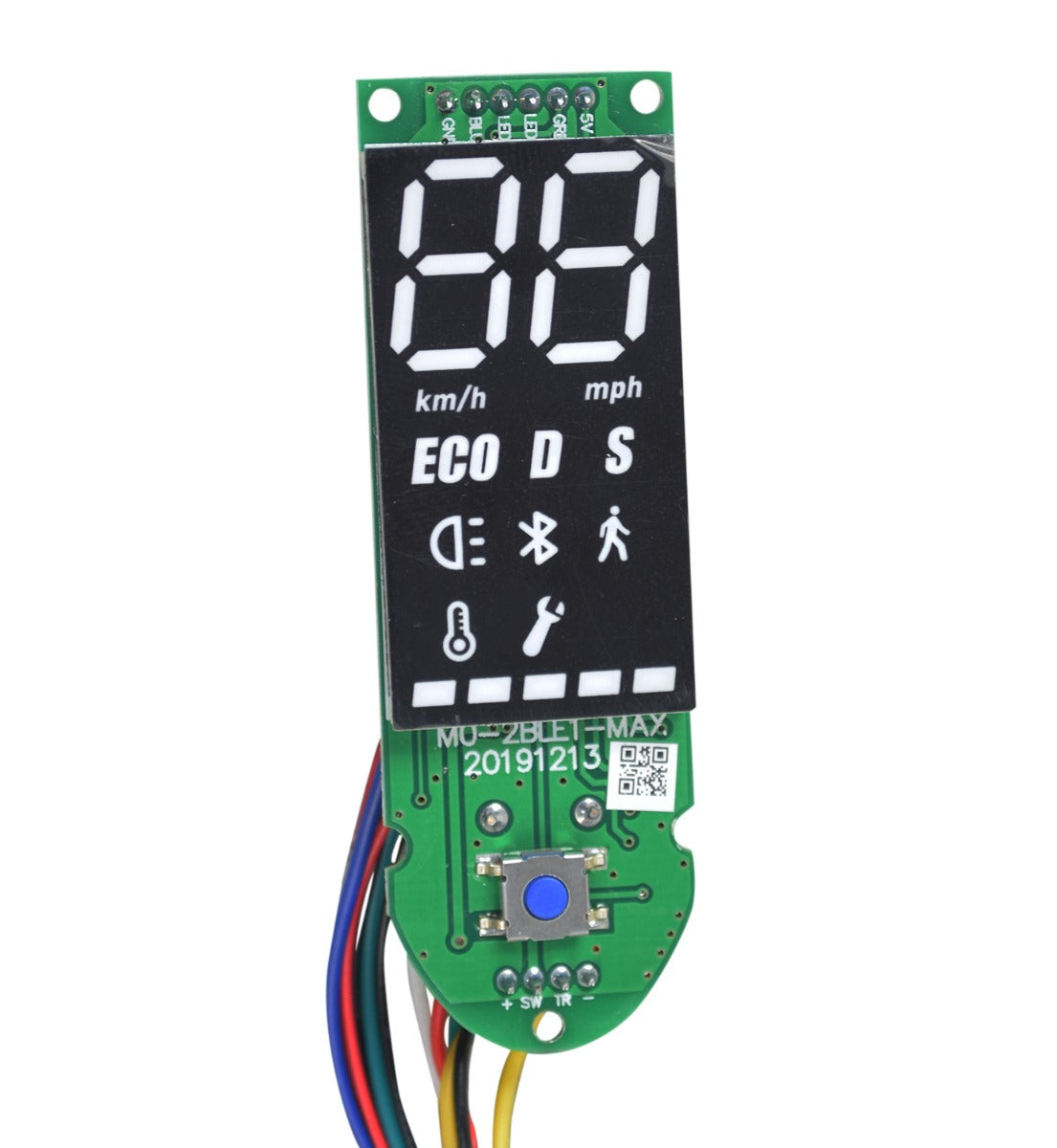 Basically a Printed Circuit Board (PCB) together with the On/Off switch and wires, the Bluetooth board uses an LED panel to show the scooter's speed, lights, and other vital pieces of riding information.