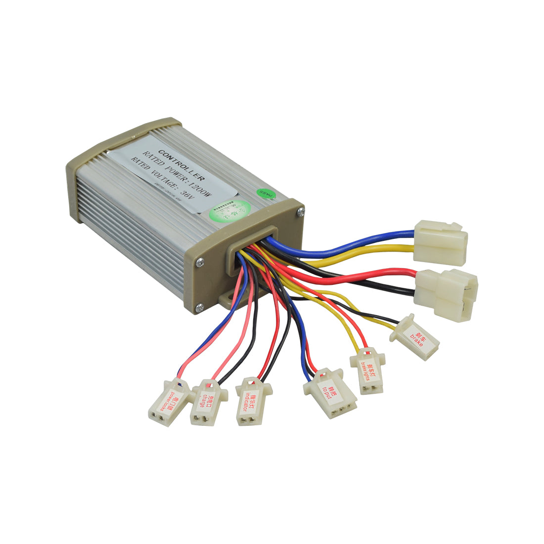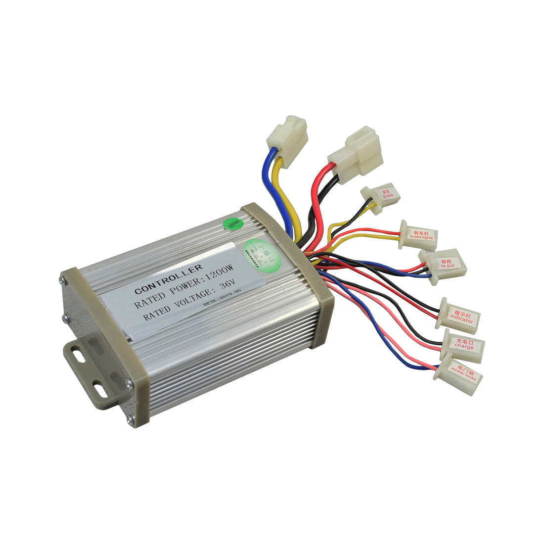 Here is our 36 Volt 1200 Watt universal voltage/speed controller for electric scooters, bikes, go karts, and mopeds. This controller has eight connectors: Battery, Motor, Charger, Lock, Throttle, Brake Connector, Brake Light, and Pilot Lamp.