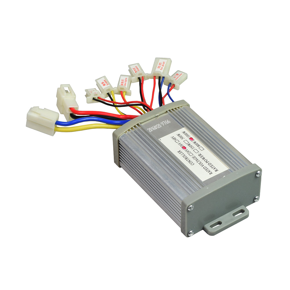 Here is an excellent 36 volt 1000 watt universal voltage/speed controller for electric scooters, bikes, go-karts, and mopeds. This controller has eight connectors: Battery, Motor, Charger, Lock, Throttle, Brake Connector, Brake Light, and Pilot Lamp.