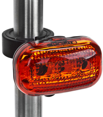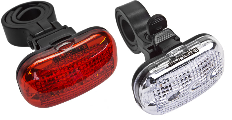 The advanced Nichia LED front light offers up to 200 hours of run time off of a pair of (included!) AAA batteries. It features two operating modes; steady and flashing, and will easily mount on just about any standard handlebar tube. Safe riding at night requires a decent tail light as well, and this super bright LED tail lamp uses the same two operating modes (steady and flashing) as its headlight sibling.