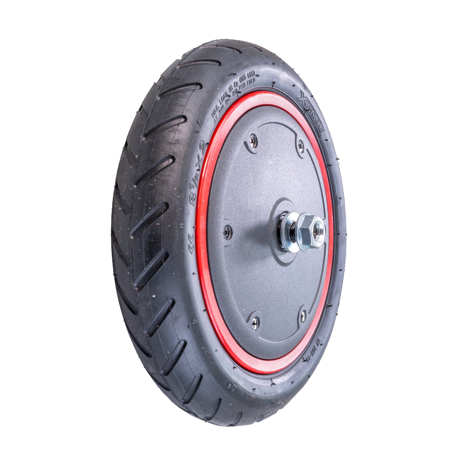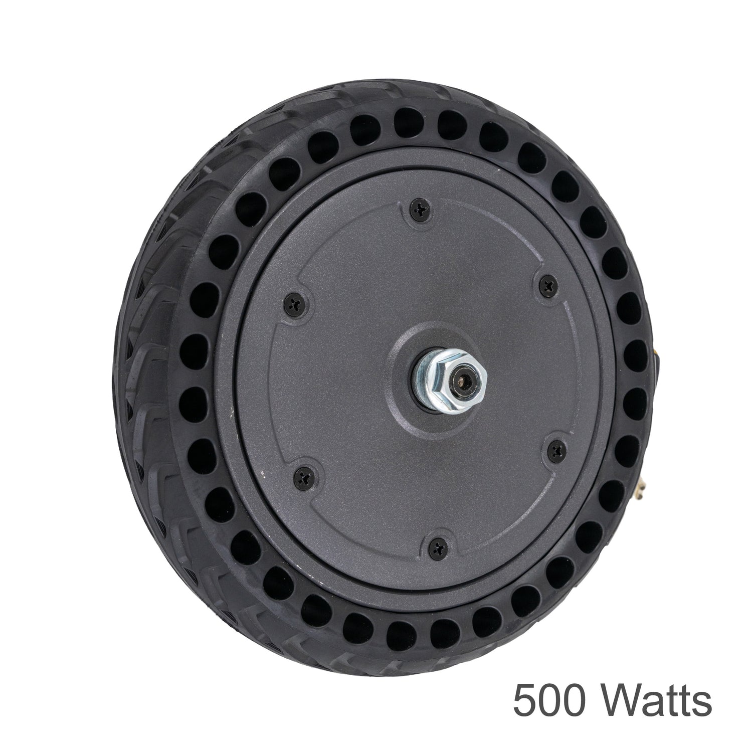 If you need a replacement hub motor and front wheel assembly for the Xiaomi Mi M365 electric scooter you have found the right page. This hub motor is made in two wattage versions, 350W and 500W. Dimensionally, all five hub motor/front wheel assemblies are identical. Three options sport an 8-1/2"x2" inner tube and pneumatic tire, while the other two utilize a flat-free honeycomb tire. Both have low-siped street tread perfect for the city pavement. One version of the 500W comes with a sharp-looking red trim around the rim.