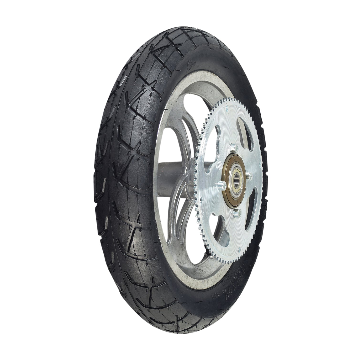 Scooter rear wheel assembly measuring 12-1/2"x2-1/4". This assembly comes complete with curved spoke rim, tire, tube, 6001ZZ bearings, and 80 tooth #25 chain sprocket.