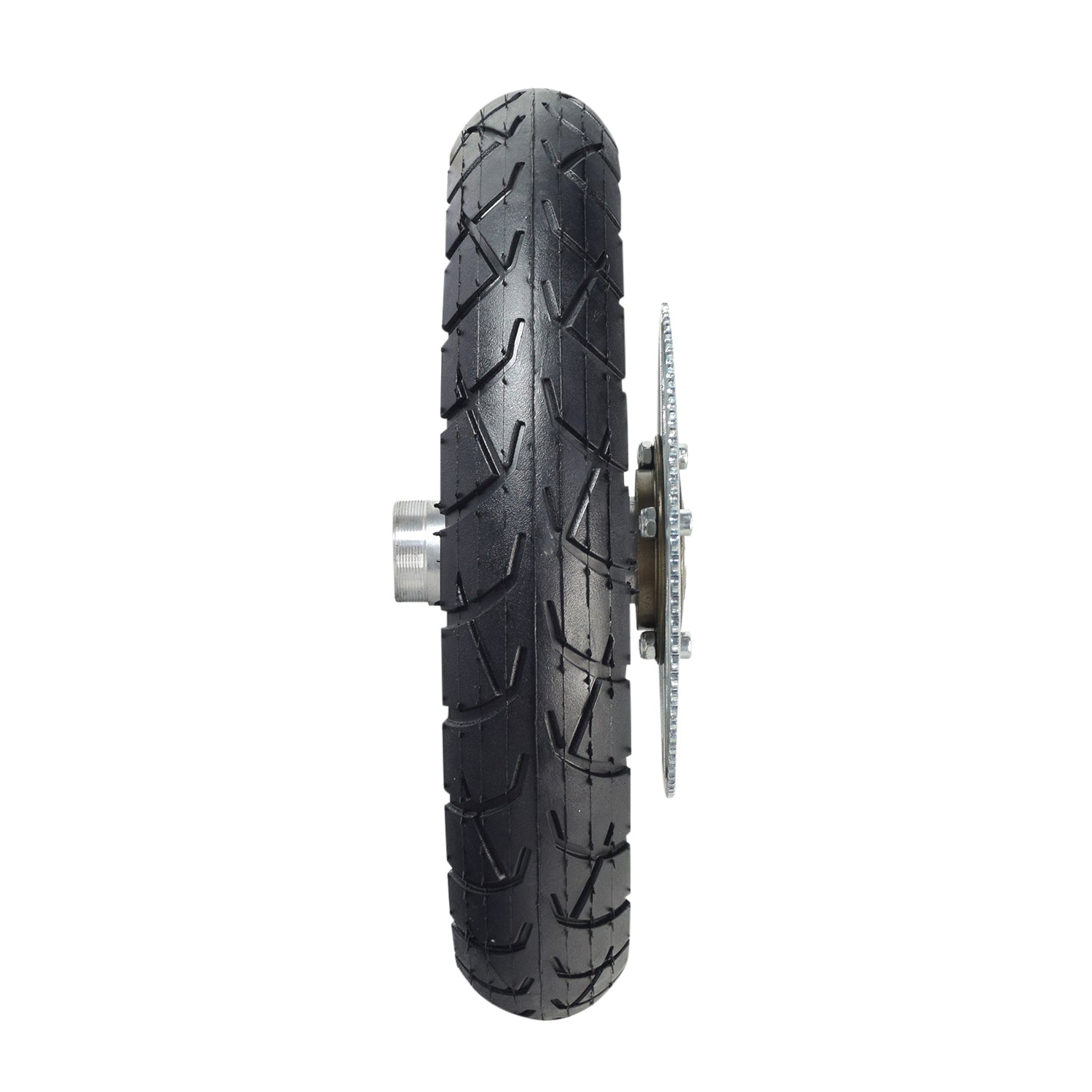 A common sized wheel on low power electric scooters, but can be used on custom projects of all sorts, as this size of scooter tire and #25 chain is affordable and easily sourced.