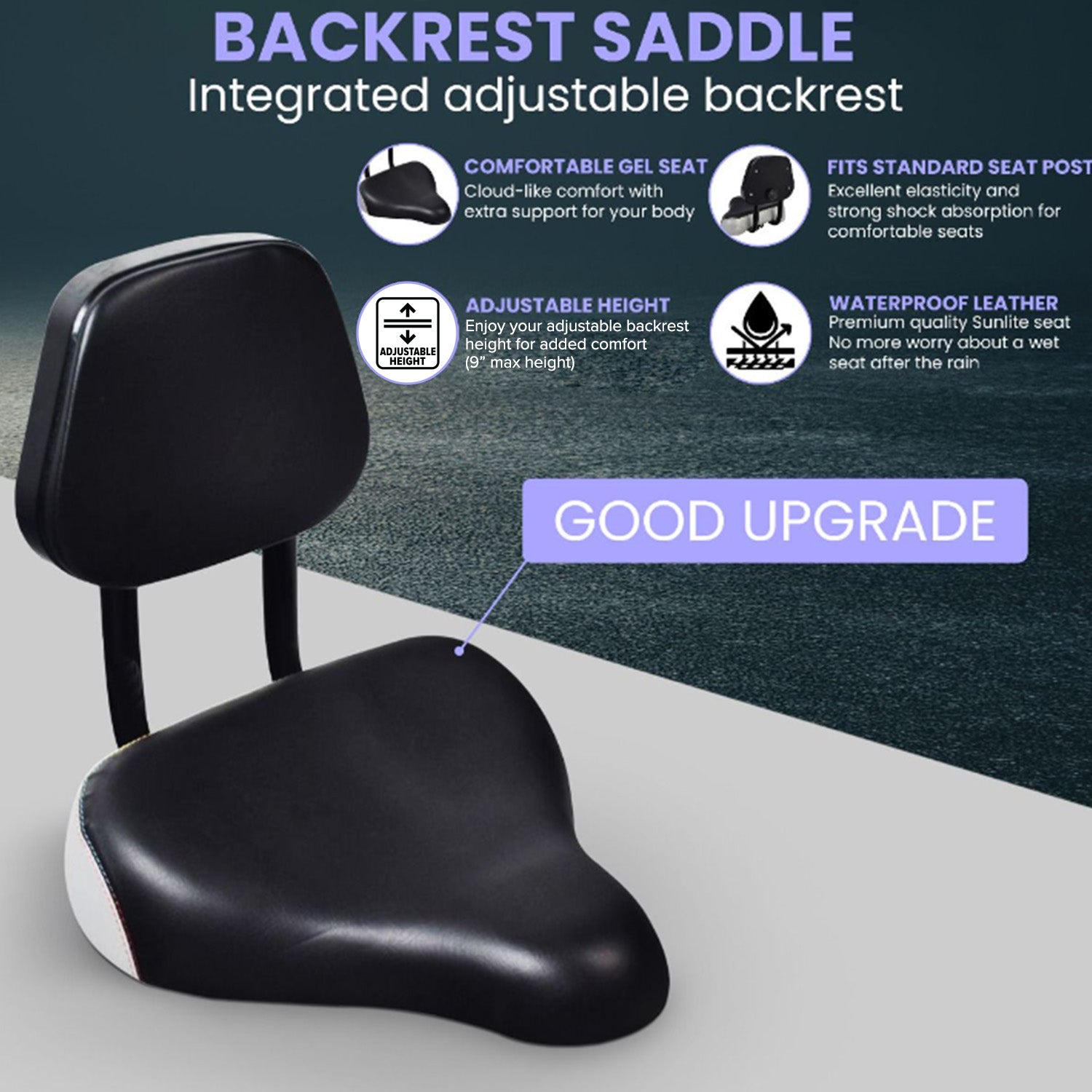 The Backrest Saddle Seat is a great aftermarket bike or scooter accessory that adds comfort to your ride. Do you need a little more comfortable bike saddle? The Backrest Saddle Seat is a great aftermarket saddle that adds comfort to your ride. This seat makes a perfect replacement on adult trikes like the Schwinn Meridian series, the electric eZip & IZIP TriCruiser, and a whole lot more models with a standard 7/8" seat post. Of special note is the backrest. Go ahead and relax. Lean back and watch the world go by in comfort.