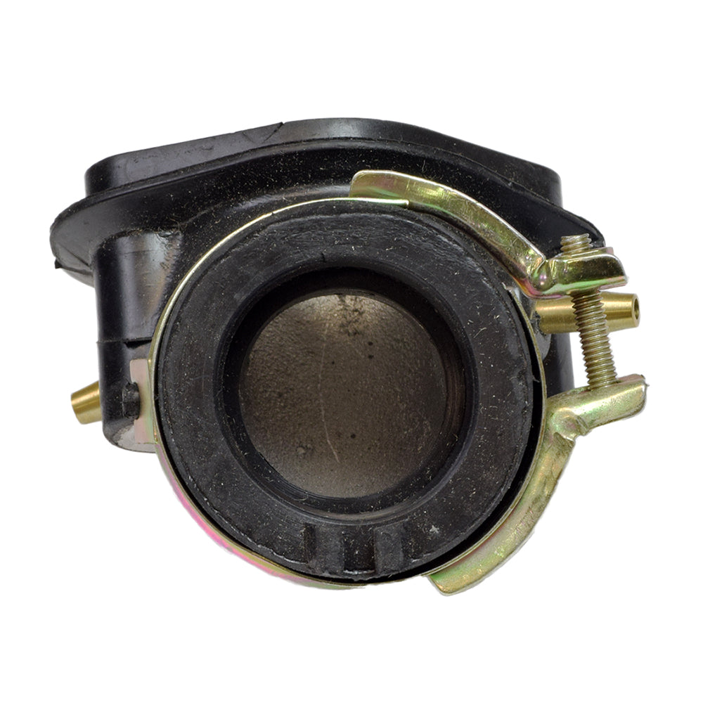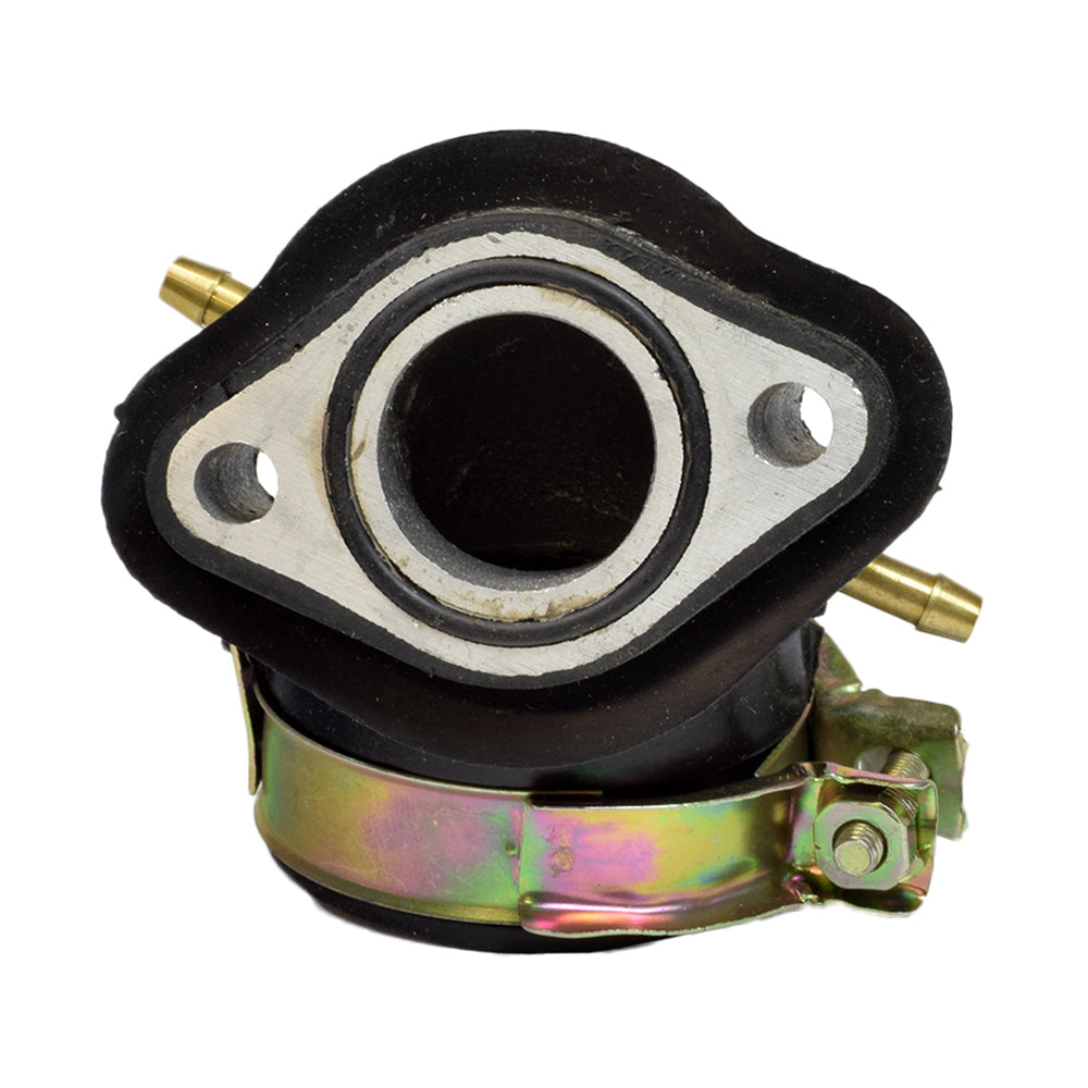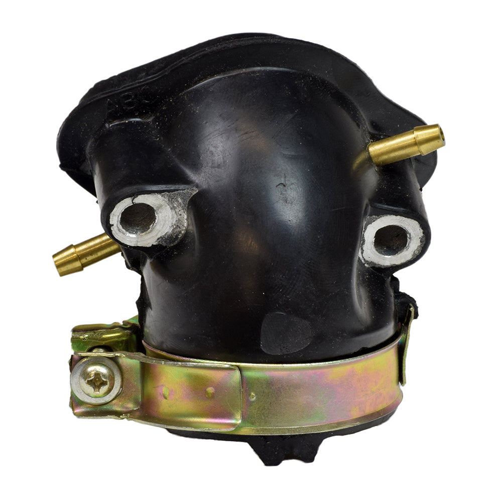 Intake manifold with dual vacuum fittings for GY6 scooter engines. This intake manifold is compatible with the Baja Motorsports Sun City (SC150) 150cc gas scooter. Includes the carburetor clamp and O-ring.
