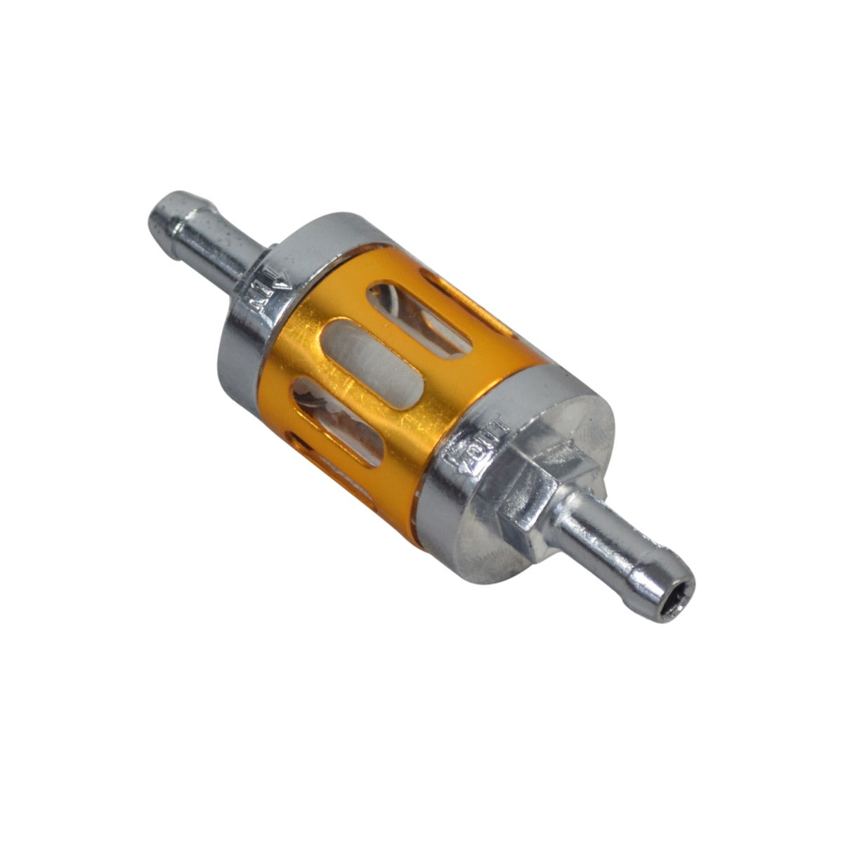 Our universal in-line chrome fuel filter for scooters, ATVs, dirt bikes, motorcycles, go-karts, and dune buggies comes in your choice of a blue or a gold colored barrel.