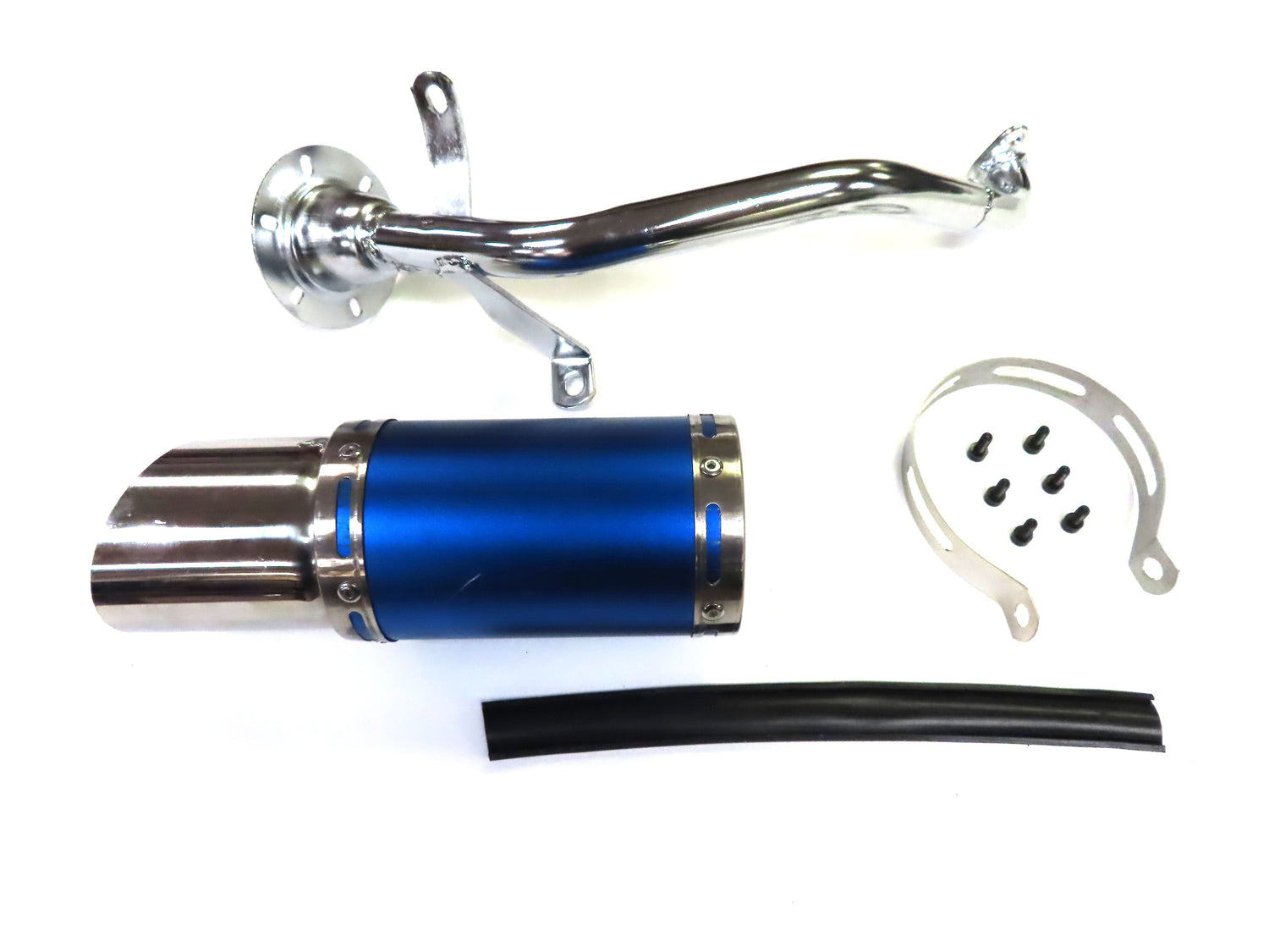 - Note: This blue Short Performance Exhaust System for GY6 150cc Scooters & Go-Karts is missing the gasket. In addition there are a few minor scratches on the chrome pipe & blue muffler body.