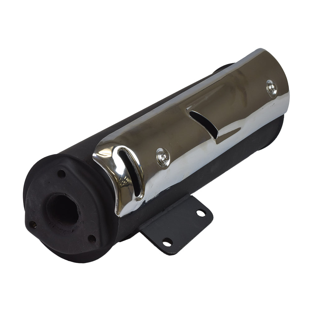 Stock quality muffler/silencer typically used on size 50cc and 70cc 2-stroke gas scooters of the Yamaha Jog clone variety. This muffler is painted black steel.