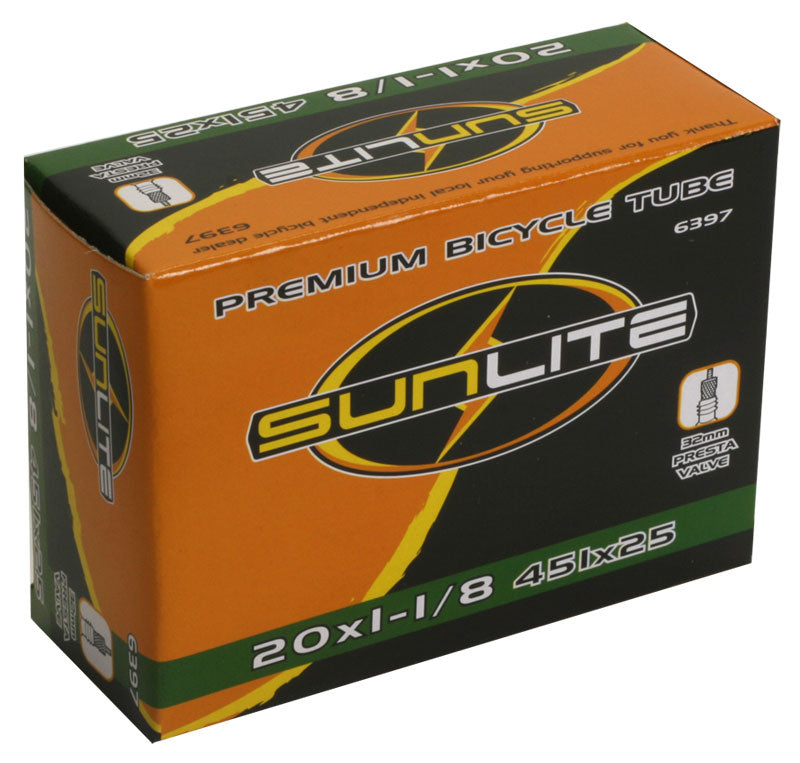 Replace your old 20"x1-1/8" bike inner tube with this great 20"x1-1/8" Bicycle Inner Tube with 32mm Presta Valve from Sunlite. Inner tubes are the most commonly replaced bike parts, and these excellent Sunlite inner tubes will get you rolling along. Let Monster Scooter Parts be your source for the latest bicycle inner tubes from Sunlite with this 20"x1-1/8" Bicycle Inner Tube with 32mm Presta Valve.