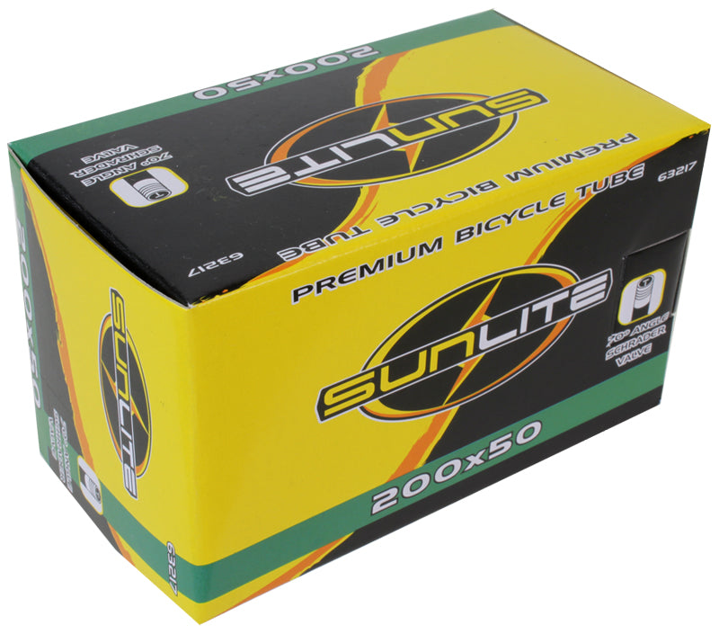 Replace your old 200x50 bike inner tube with this great 200x50 Bicycle Inner Tube with Angled Valve from Sunlite. Inner tubes are the most commonly replaced bike parts, and these excellent Sunlite inner tubes will get you rolling along. Let Monster Scooter Parts be your source for the latest bicycle inner tubes from Sunlite with this 200x50 Bicycle Inner Tube with Angled Valve.
