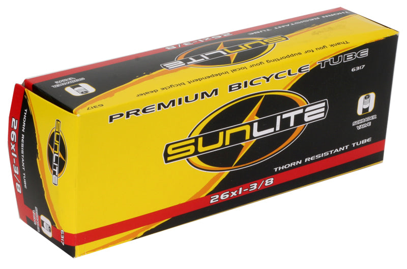Replace your old 26"x1-3/8" bike inner tube with this great 26"x1-3/8" heavy duty thorn resistant bicycle inner tube with a 32mm straight Schrader valve from Sunlite. Inner tubes are the most commonly replaced bike parts, and these excellent Sunlite inner tubes will get you rolling along. Let Monster Scooter Parts be your source for the latest bicycle inner tubes from Sunlite with this 26"x1-3/8"heavy duty thorn resistant bicycle inner tube with a 32mm straight Schrader valve.