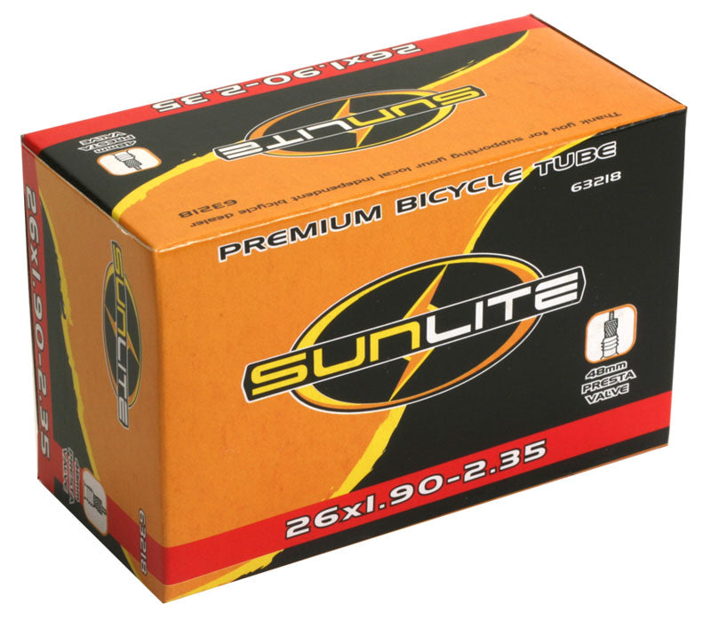 Replace your old 26"x1.90-2.35" bike inner tube with this great 26"x1.90-2.35" Bicycle Inner Tube with 48mm Presta Valve from Sunlite. Inner tubes are the most commonly replaced bike parts, and these excellent Sunlite inner tubes will get you rolling along. Let Monster Scooter Parts be your source for the latest bicycle inner tubes from Sunlite with this 26"x1.90-2.35" Bicycle Inner Tube with 48mm Presta Valve.
