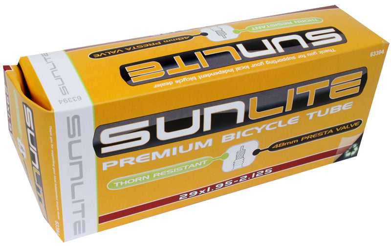 Replace your old 29"x1.95-2.125" bike inner tube with this great 29"x1.95-2.125" Heavy Duty Thorn Resistant Bicycle Inner Tube with 48mm Presta Valve from Sunlite. Inner tubes are the most commonly replaced bike parts, and these excellent Sunlite inner tubes will get you rolling along. Let Monster Scooter Parts be your source for the latest bicycle inner tubes from Sunlite with this 29"x1.95-2.125" Heavy Duty Thorn Resistant Bicycle Inner Tube with 48mm Presta Valve.
