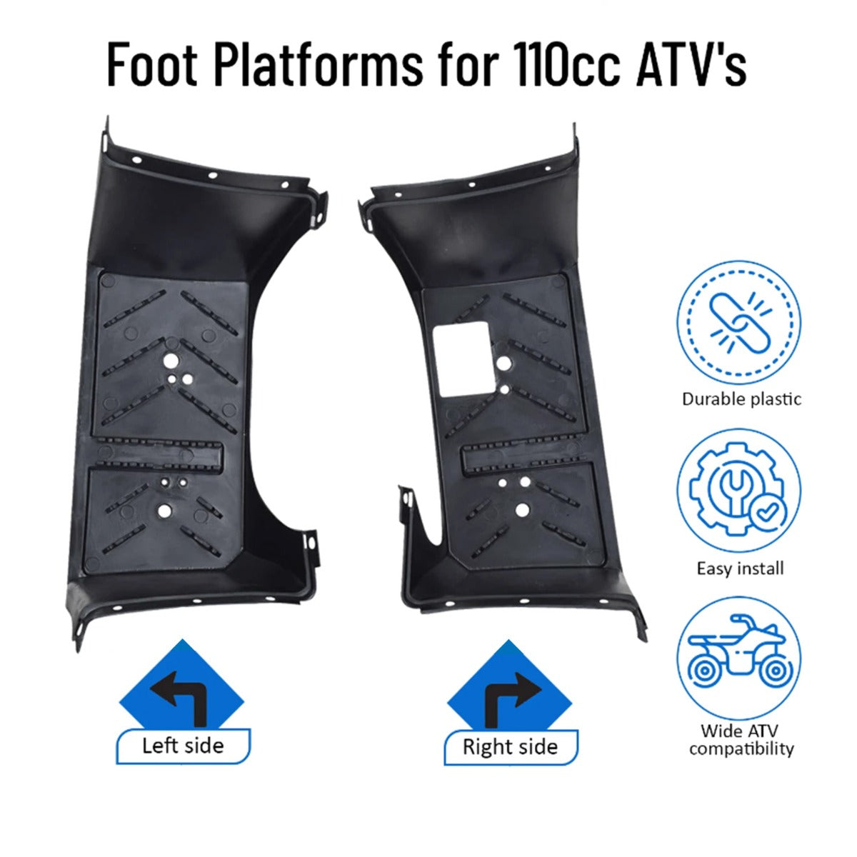 A new set of replacement foot platforms for 110cc ATVs is just what the doctor ordered for that old mud machine. Some parts are made to get tattered and are soon in need of replacing. The set of left and right side footrest platforms will easily mount on your TaoTao ATA-110B, ATA-110B3, Coolster ATV-3050C, and many other models. You may have to redrill a mounting hole or two, but identical plastic platforms are found on a number of Chinese-made ATVs.