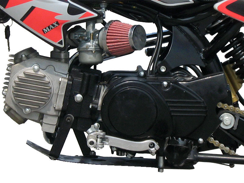 Universal fit dirt bike air filter (air cleaner) for most sizes of mini ATVs & dirt bikes. This dirt bike part is compatible with engine sizes of 49cc, 50cc, 70cc, 90cc, 110cc, & 125cc/150cc and available in three colors: Silver, black, and red.