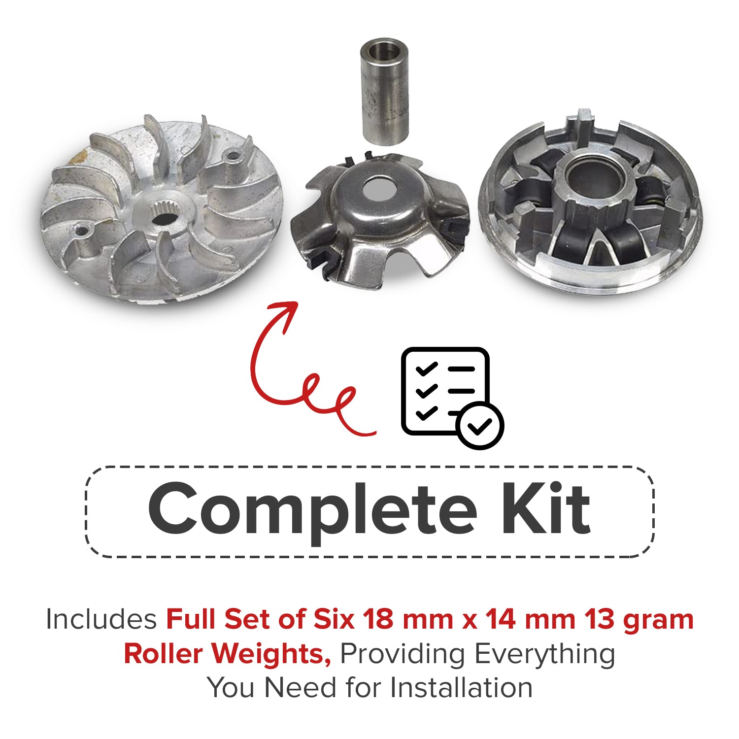 This 19 spline variator assembly for scooter & go-kart engines, specifically size 125cc GY6 QMI152/157 and 150cc GY6 QMJ152/157 comes complete with a full set of six 18 mm x 14 mm 13 gram roller weights. The variator assembly is used on a wide variety of scooters and ATV brands and models that have Chinese built 125cc GY6 QMI152/157 and 150cc GY6 QMJ152/157 engines.
