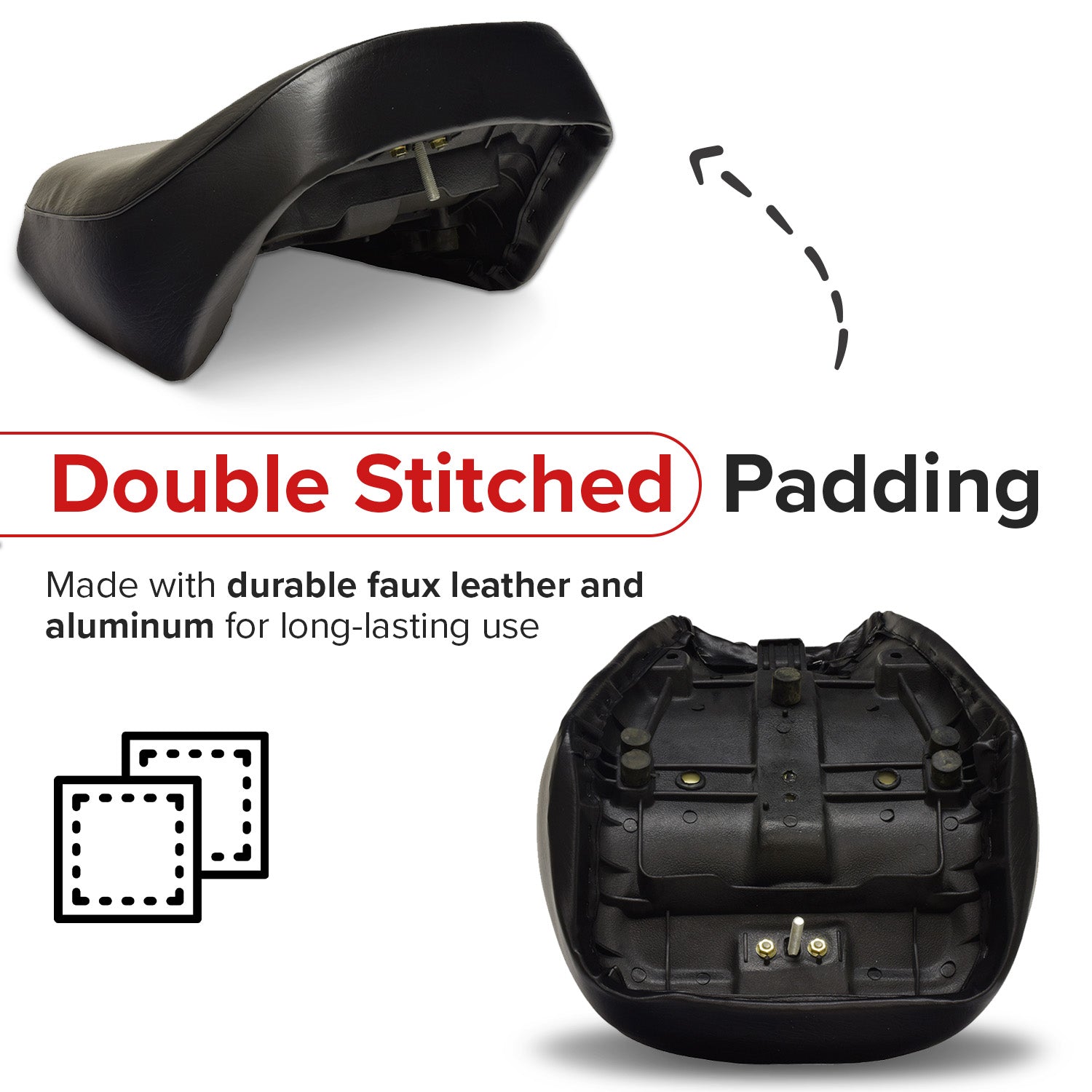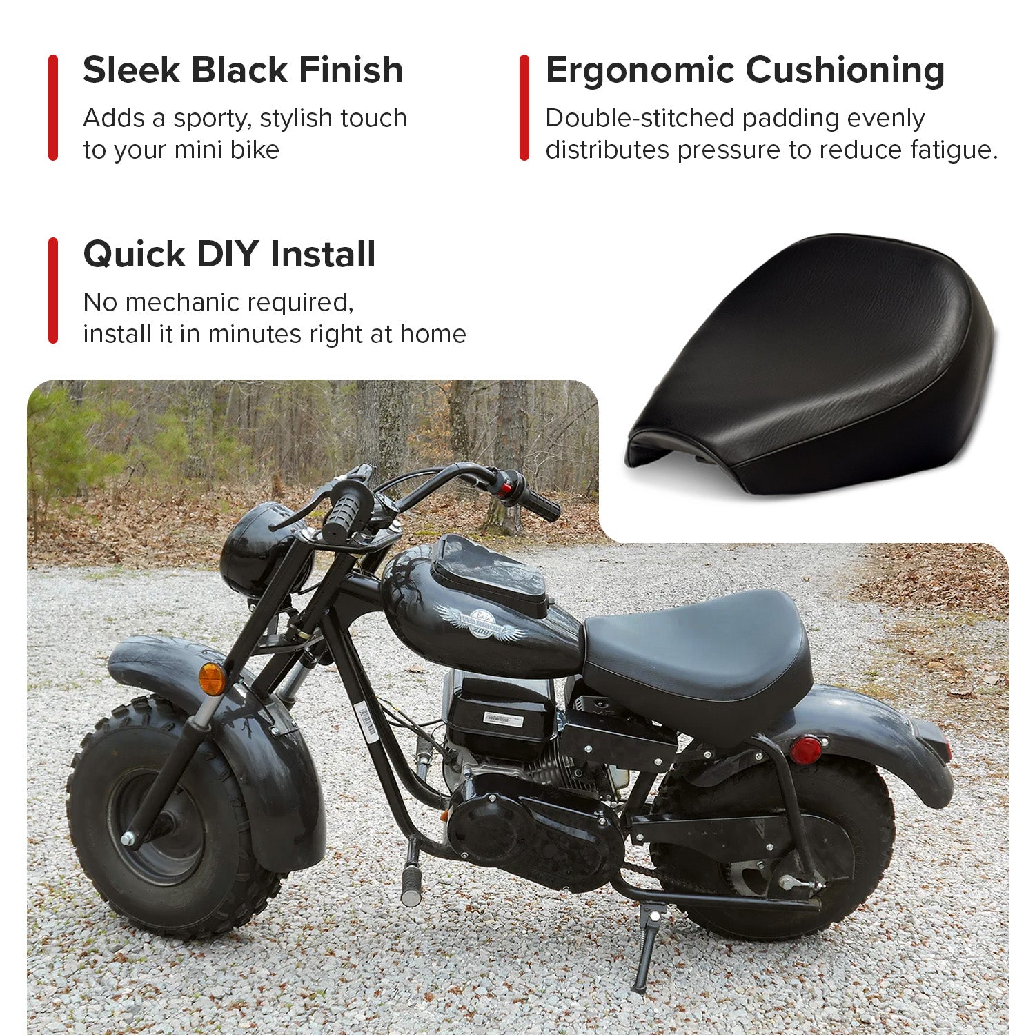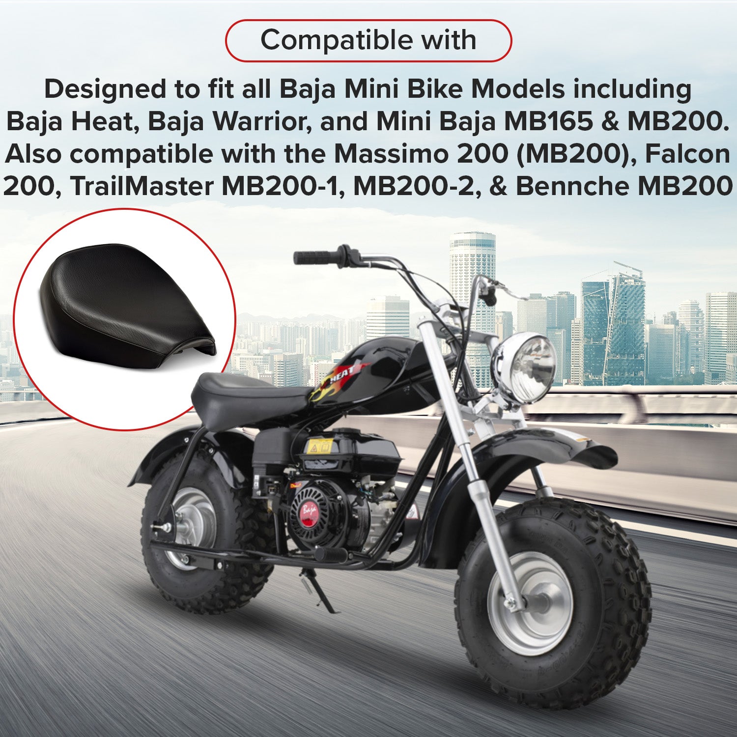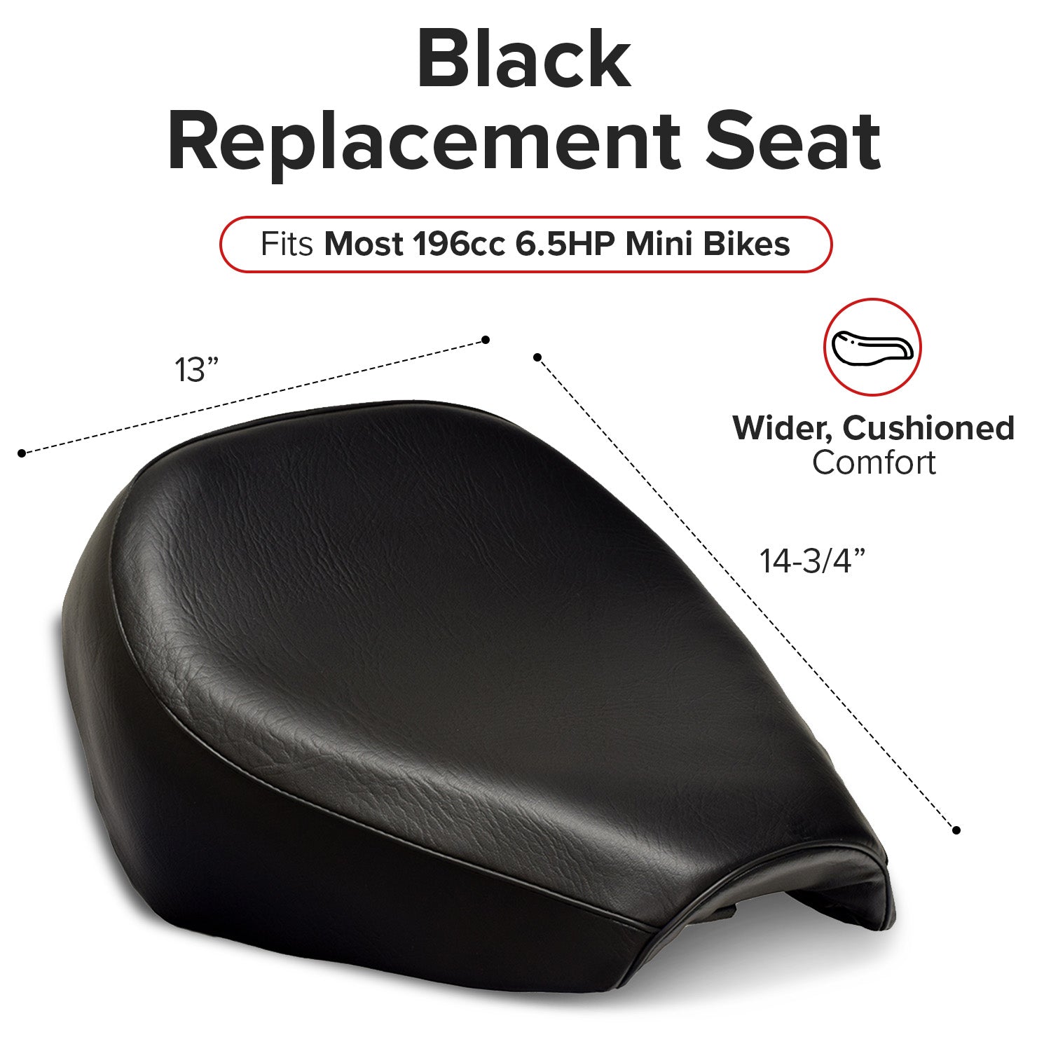 Our replacement seat for the TrailMaster MB200 mini bike is a perfect fit and will look a lot better than that torn & tattered old saddle you are replacing. This wide and comfortable seat is covered in padded black vinyl upholstery.