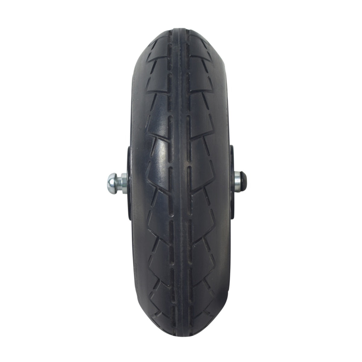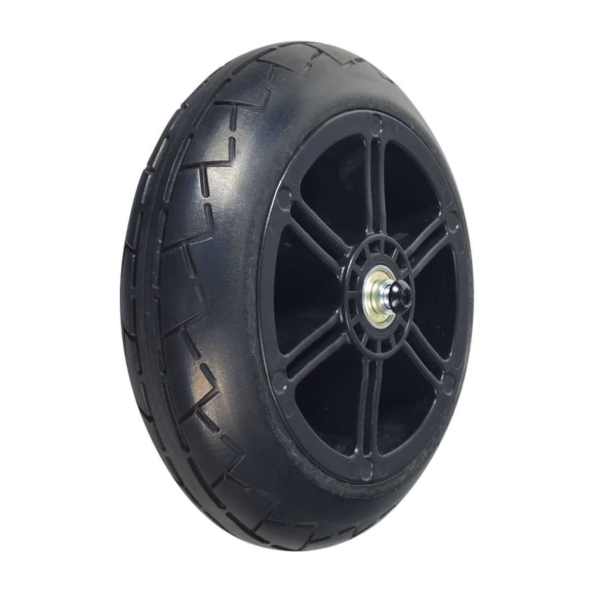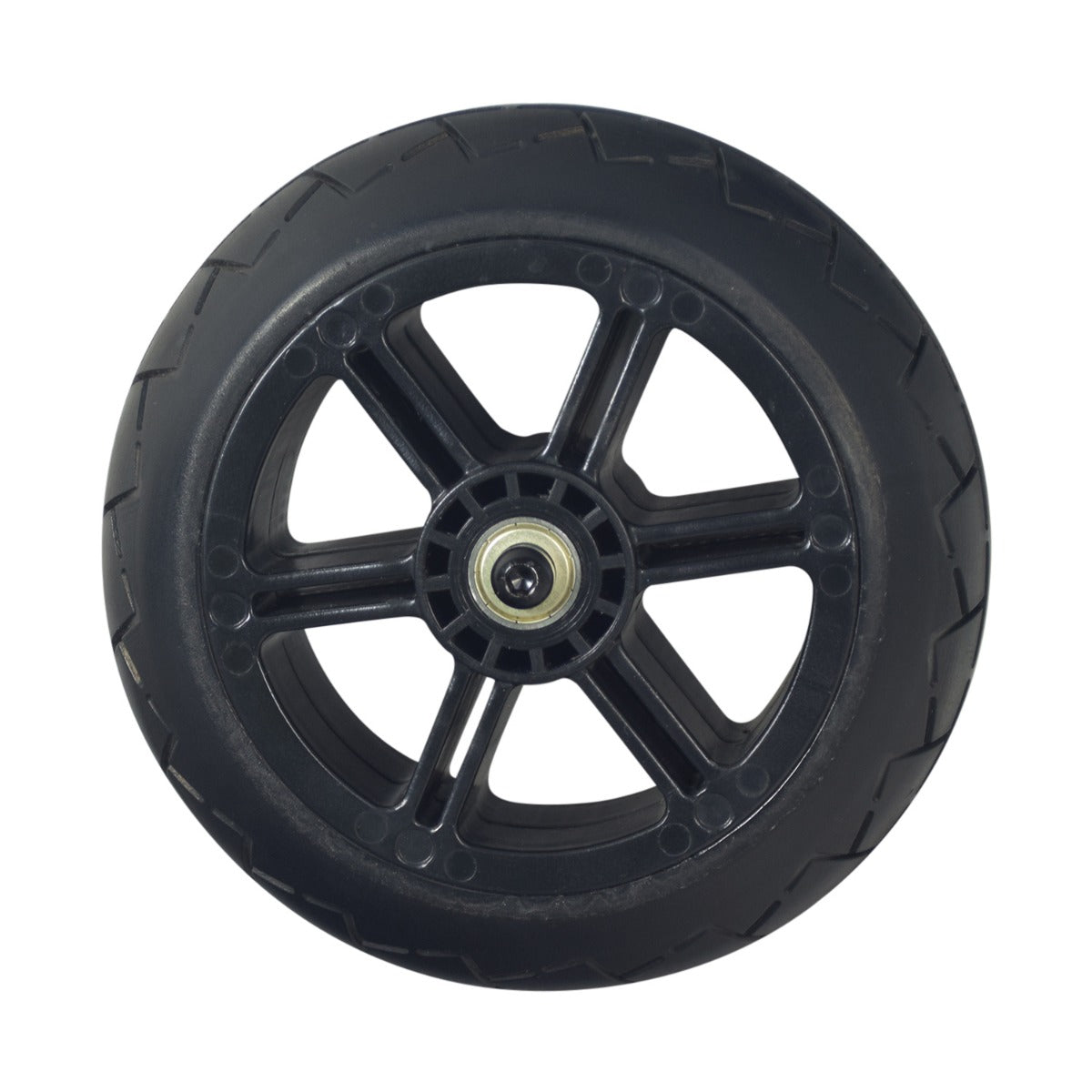 The front wheel assembly with axle for the Viro Rides Vega 2-in-1 scooter features a flat-free 6.89" (175 mm) polyurethane tire on a 6-spoke black plastic rim. The fork and front fender are not included.