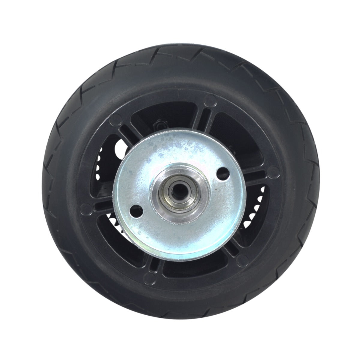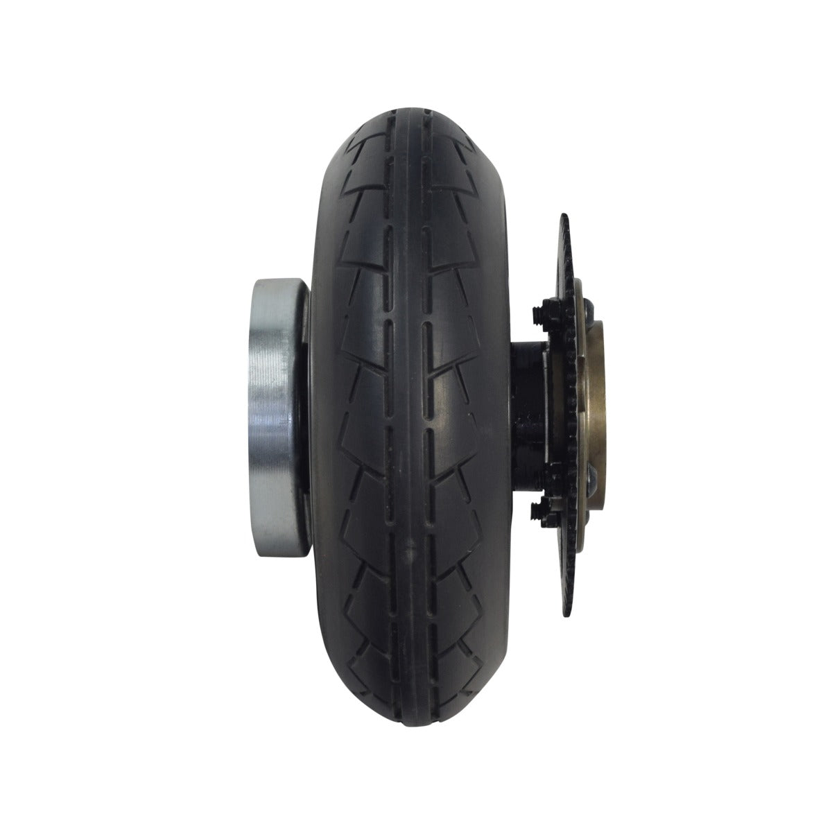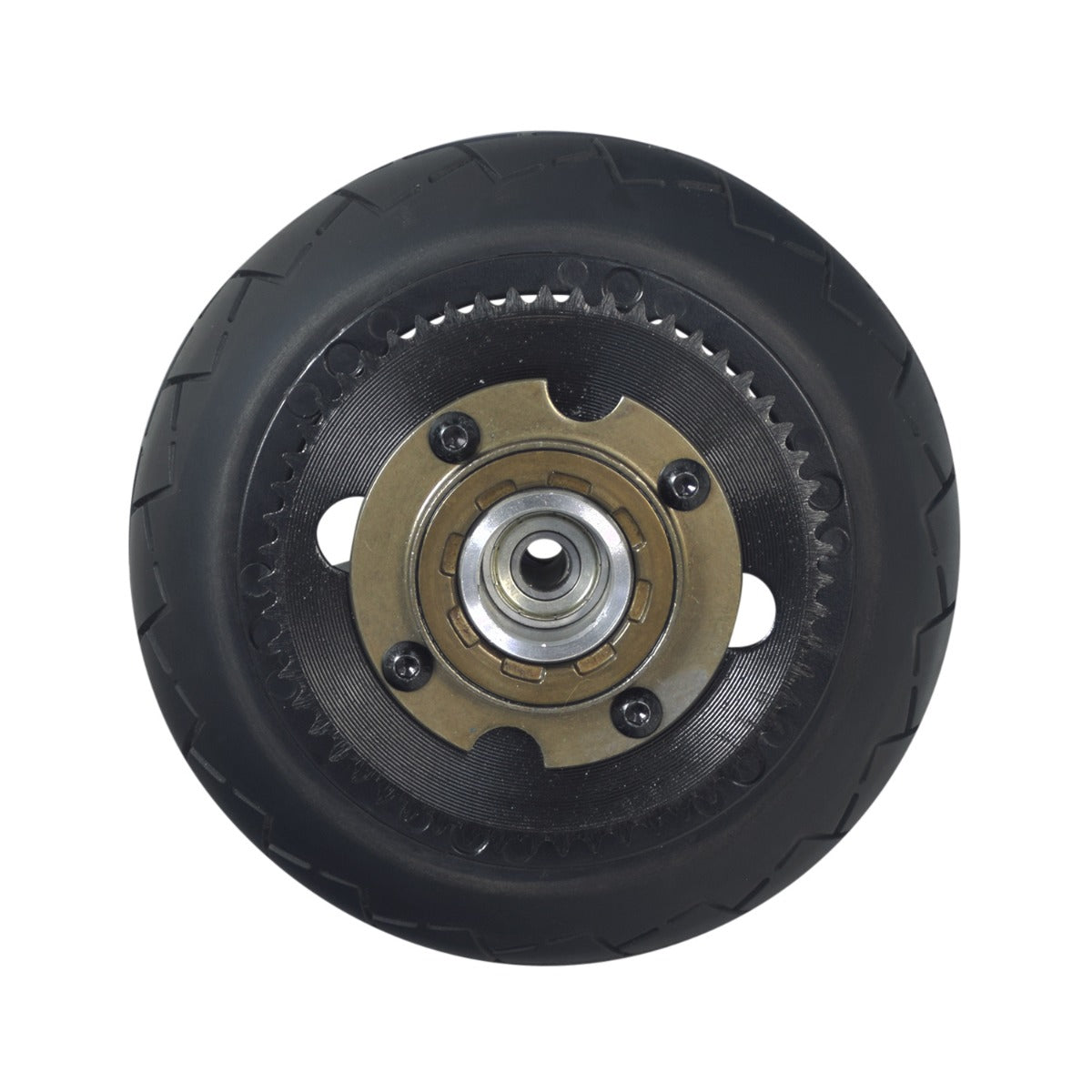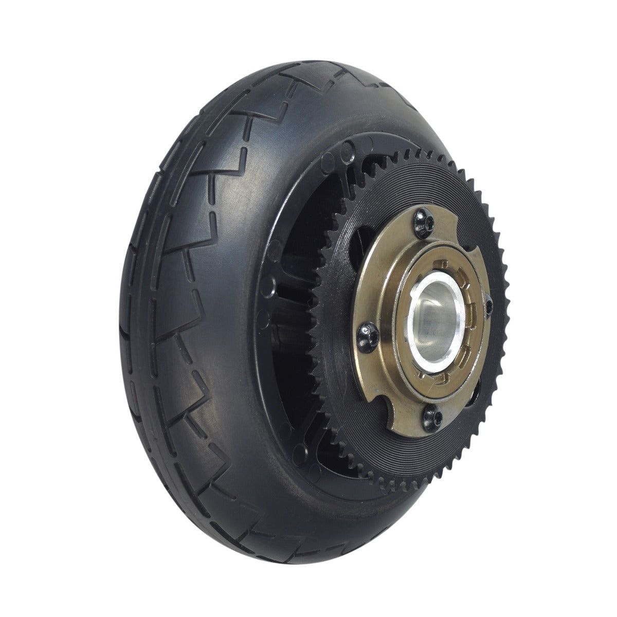 We offer the rear wheel assembly for the Viro Rides Vega 2-in-1 scooter as an all-in-1 assembly that includes the solid polyurethane tire, rim, hub, bearings, 55 tooth sprocket, and brake drum.