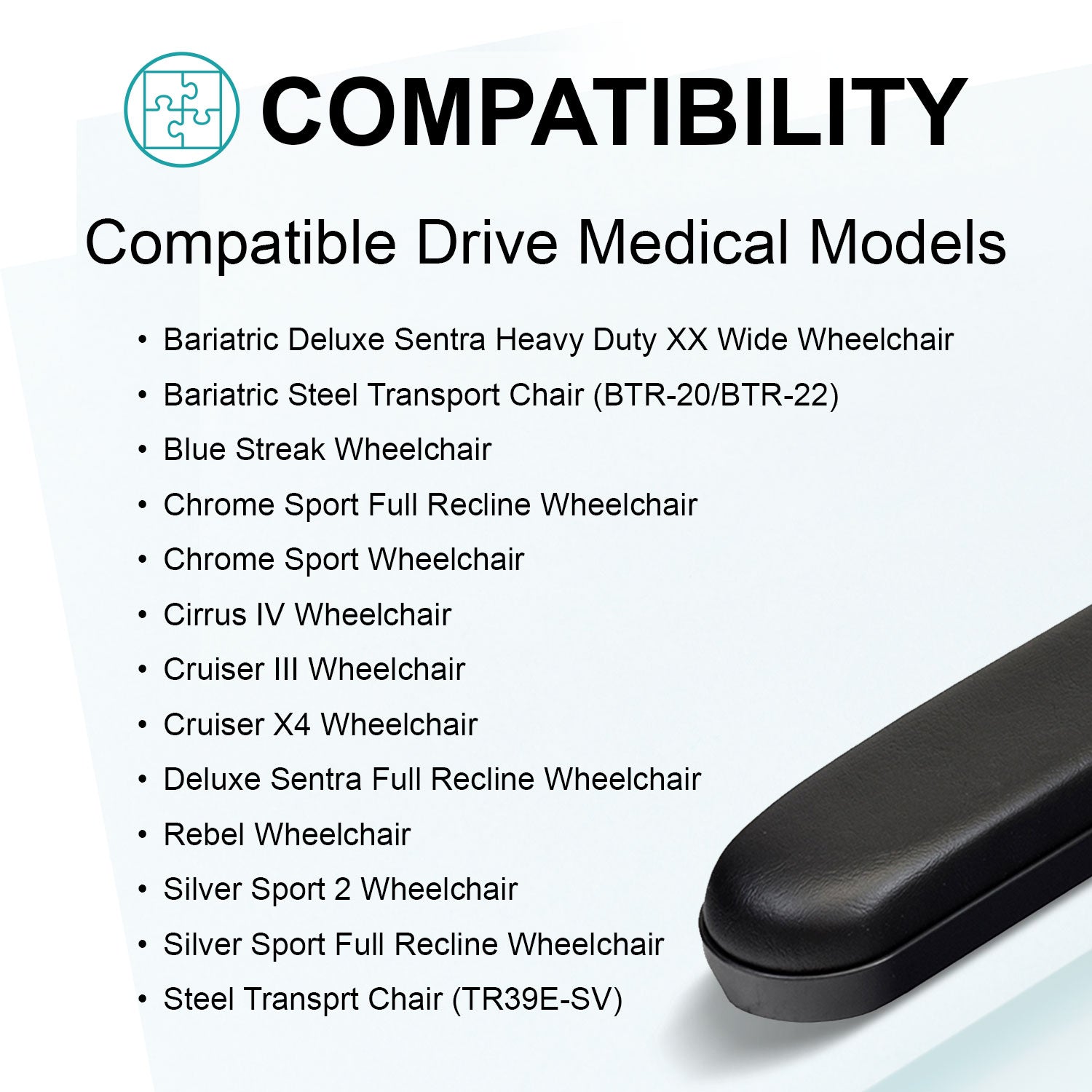 These armrest pads are compatible with several models of Drive wheelchairs and transport chairs, so please refer to the Compatibility page for the full listing.