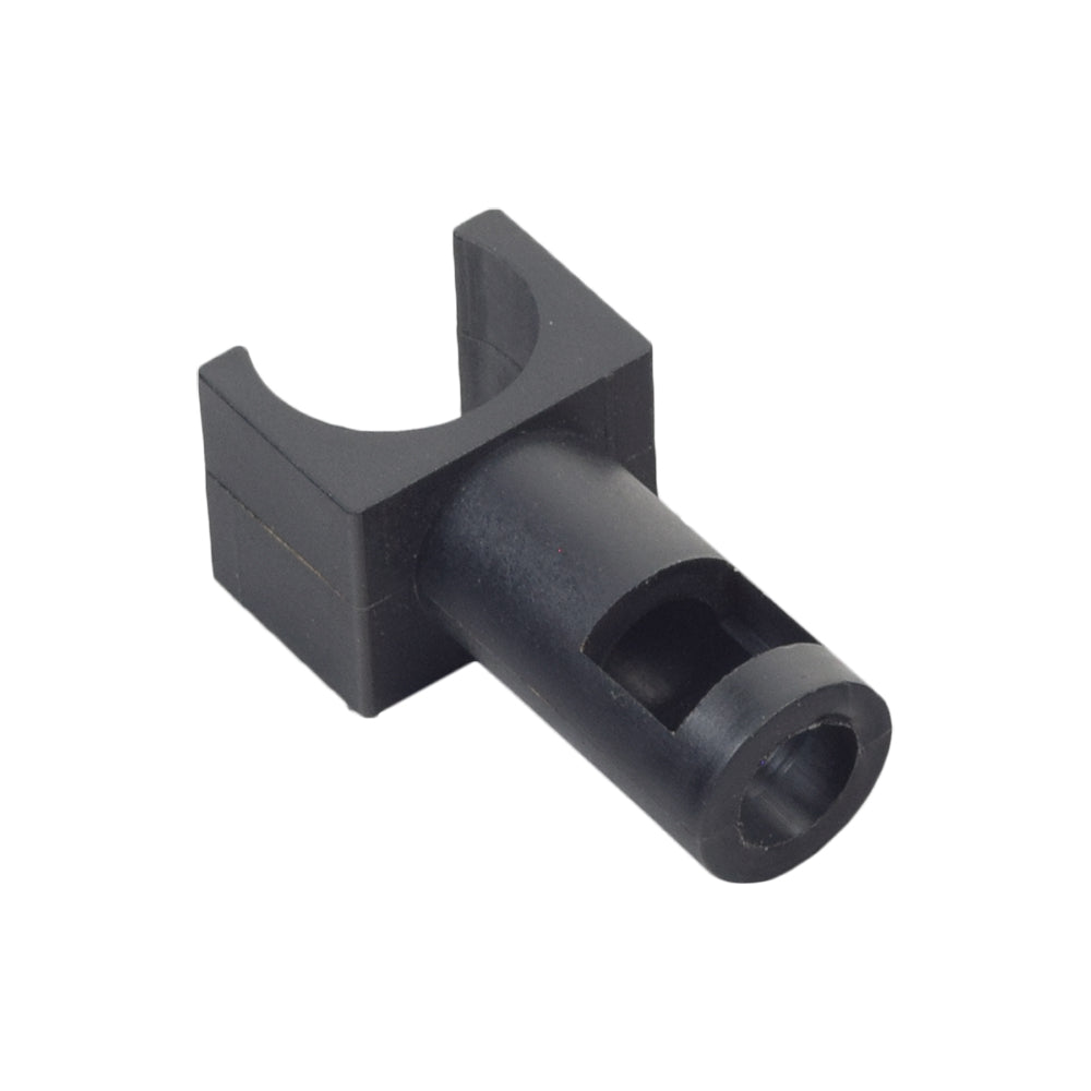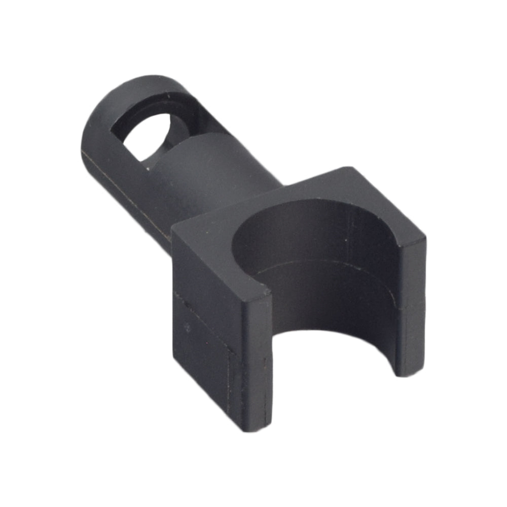This front U-shaped seat rail guide for manual wheelchairs with 7/8" tubing supports and connects the seat frame tubes to the back frame tubes. This black plastic part keeps the chair lightweight as it negates the need for heavy welded steel framing.