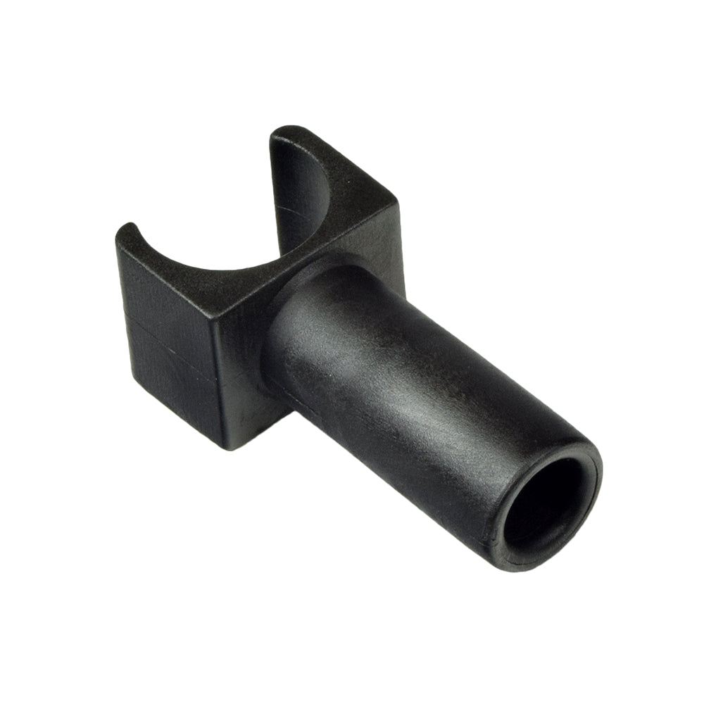 The seat rail guide for Drive Medical Aluminum Transport & Poly-Fly manual wheelchairs supports and connects the seat frame tubes to the back frame tubes. This black plastic part keeps the chair lightweight as it negates the need for heavy welded steel framing.