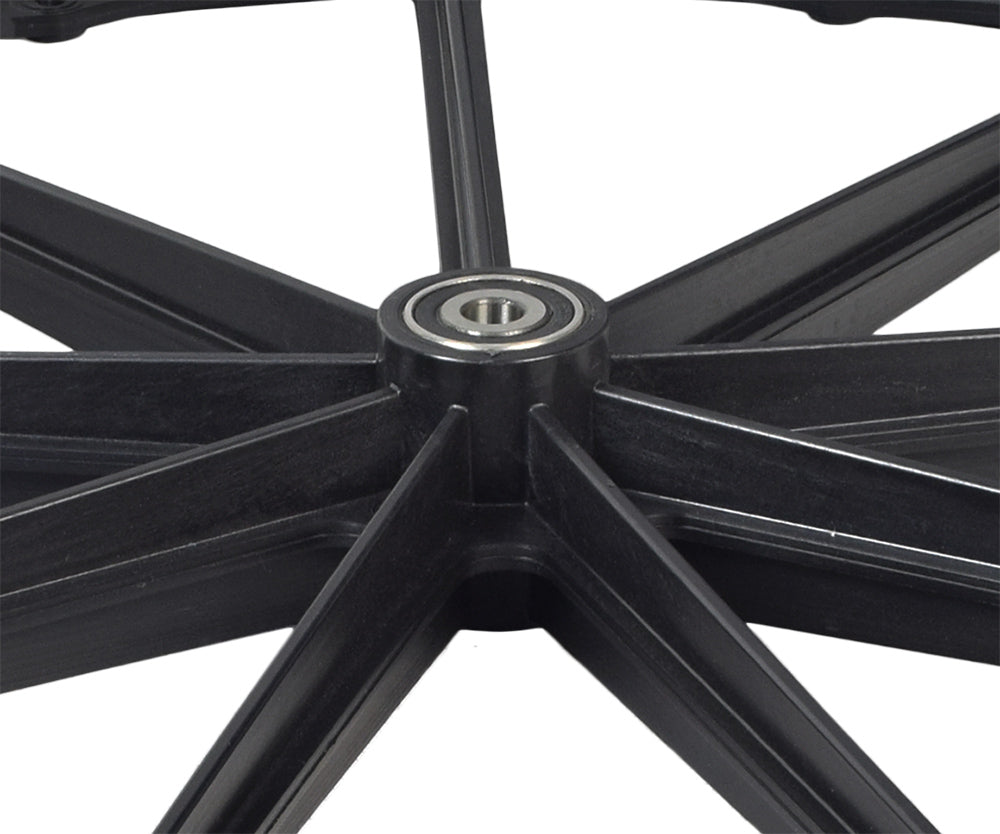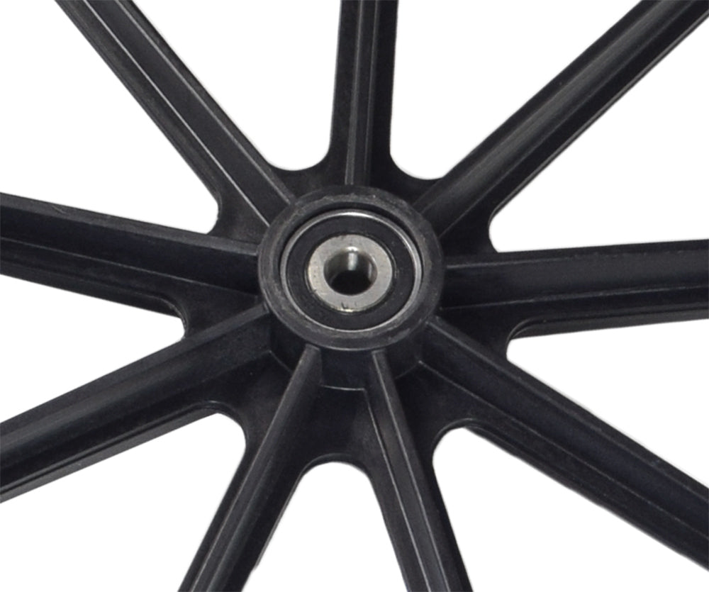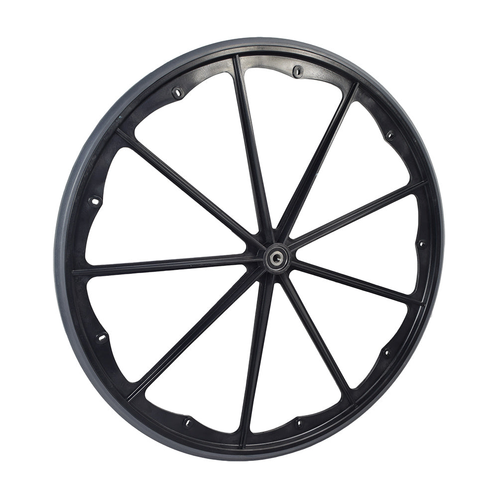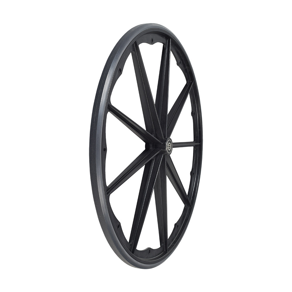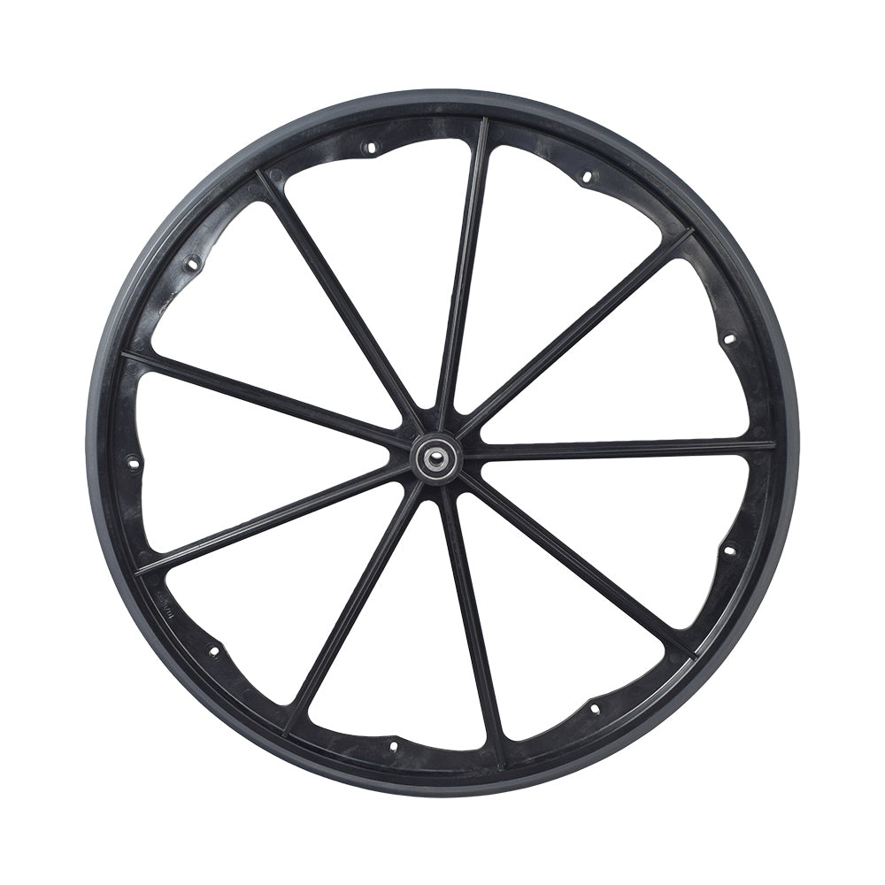 The 24" wheel assembly for the Invacare Tracer SX5 manual wheelchair features a solid urethane tire mounted on a 9-spoke wheel. This assembly comes with pre-installed 1620RS bearings to fit a 7/16" axle.