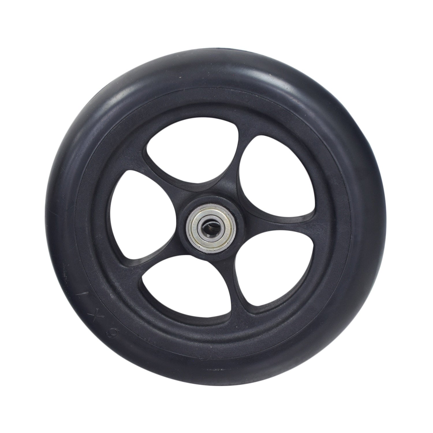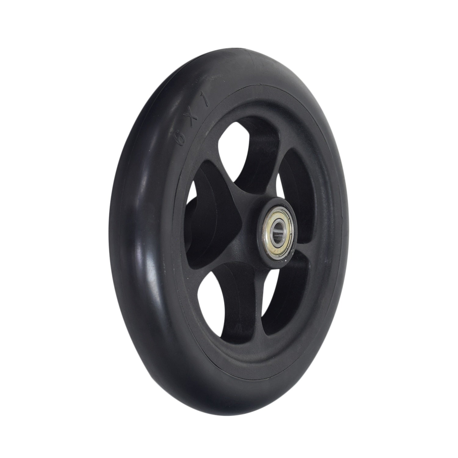 The 6" caster wheel for the Pride Stylus LS manual wheelchair sports a 6"x1" flat-free solid tire on a 5-spoke rim. This assembly includes the bearings, spacers, washers, and axle bolt.