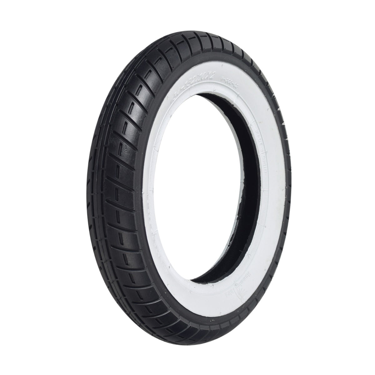 The 10"x2" pneumatic whitewall tire for the Razor Pocket Mod Petite electric scooter sports a retro-style whitewall side and a shallow-siped street tread that is very reminiscent of the classic Euroscooters of the past.