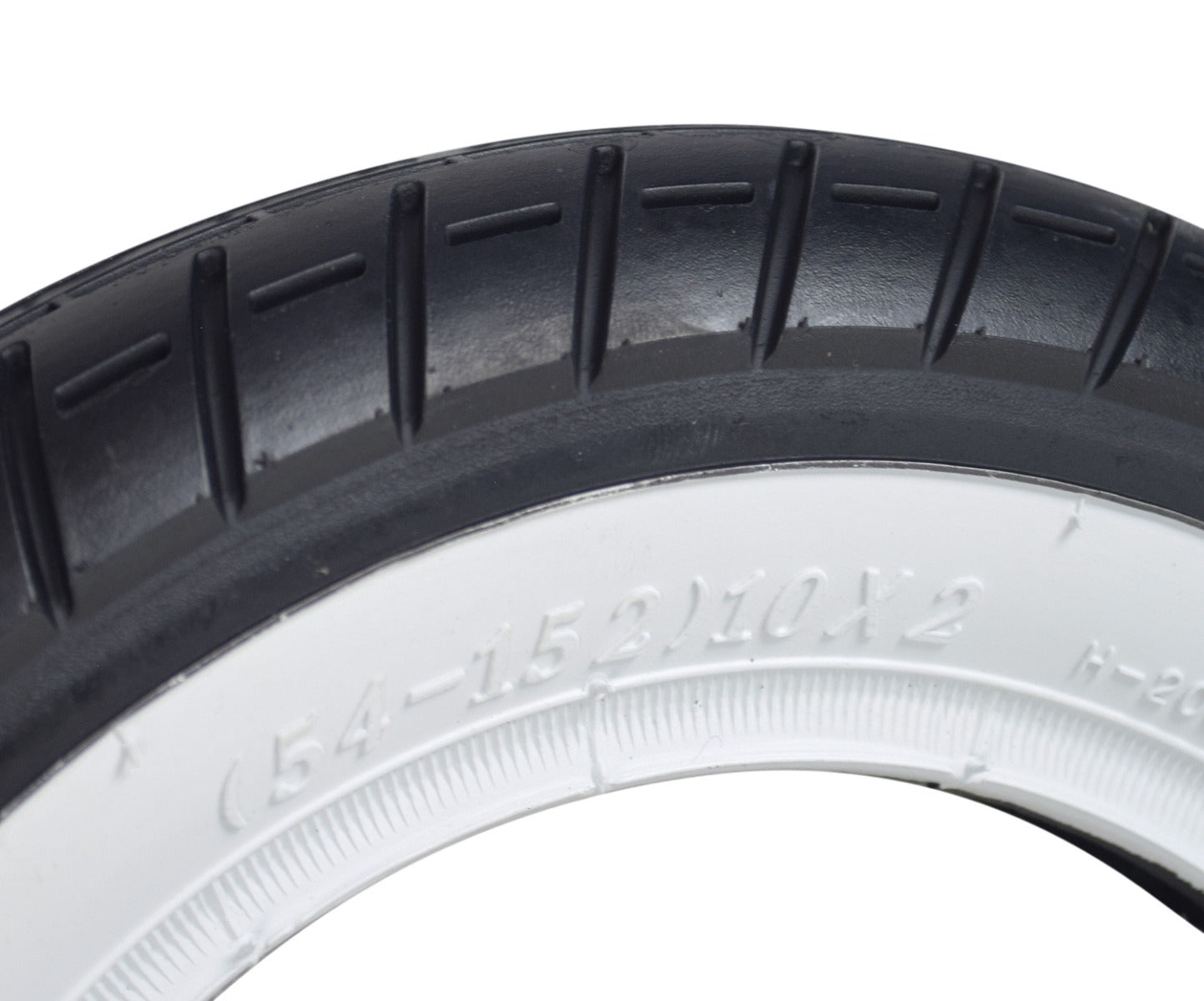 If you love the cool retro look of whitewall tires, this is the one. This tire size is also referred to as 54-152. This tire size is very common, so any scooter that uses a standard blackwall 10"x2" or 54-152 tire can be spruced up with these whitewall tires.