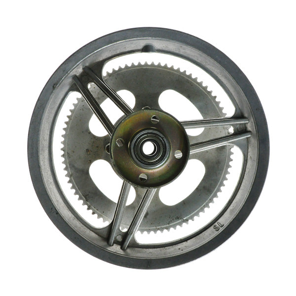 Straight spoke 12-1/2 x 2-1/4" scooter rear rim complete with 80 tooth #25 chain sprocket, bearings, and brake drum. This rear wheel assembly is used extensively on Chinese electric scooters, such as some models of X-Treme X-360 and Boreem electric scooters.