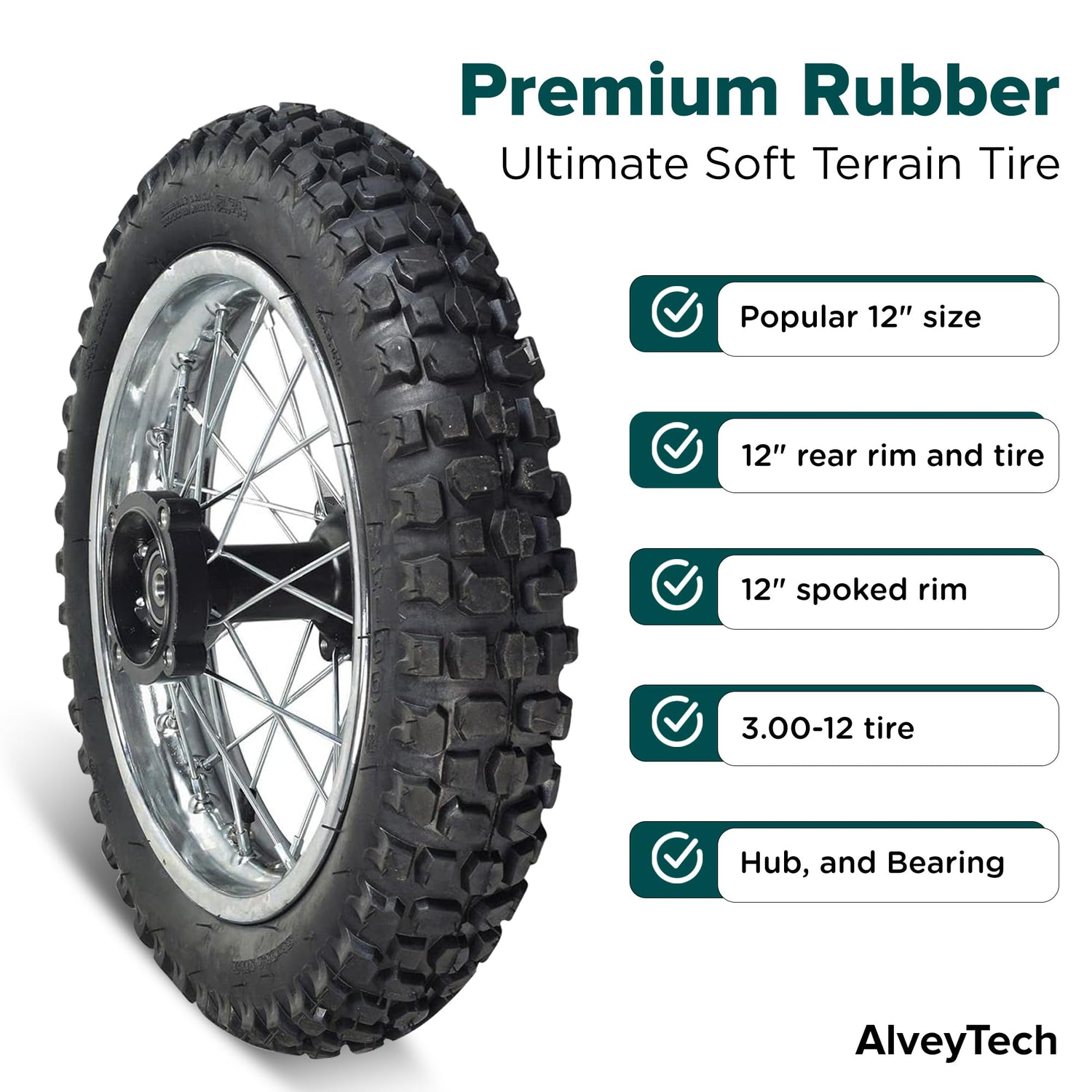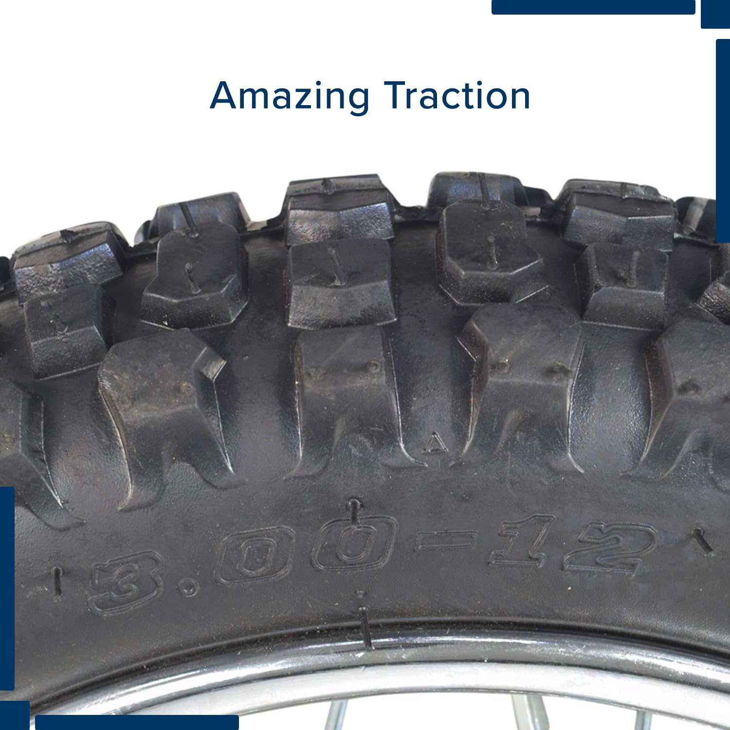 - Premium Craftmanship: Crafted with high-quality materials, our rear wheel assembly includes a knobby tread 12" (3.00-12) rubber tire, tubes and spoked rim with bearings, and a sturdy hub, ensuring long-lasting durability and reliability. Does not include brake