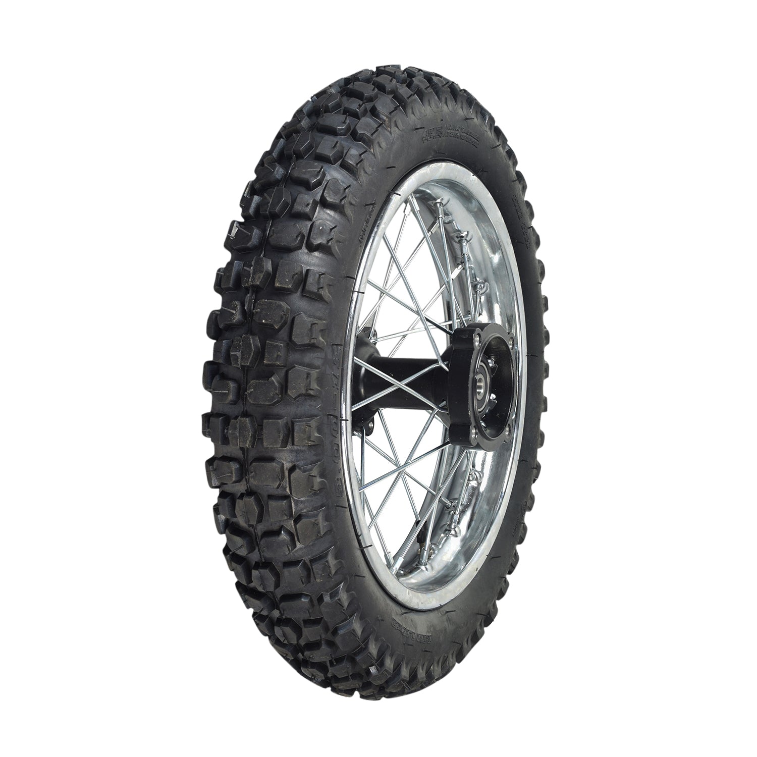 The 12" (3.00-12) Rear Rim Tire Wheel Assembly for Dirt Bikes (Version 2). This great little rear wheel assembly includes the 12" spoked rim, a 3.00-12 tire with a dirt-gripping knobby tread, inner tube, hub, and bearing.