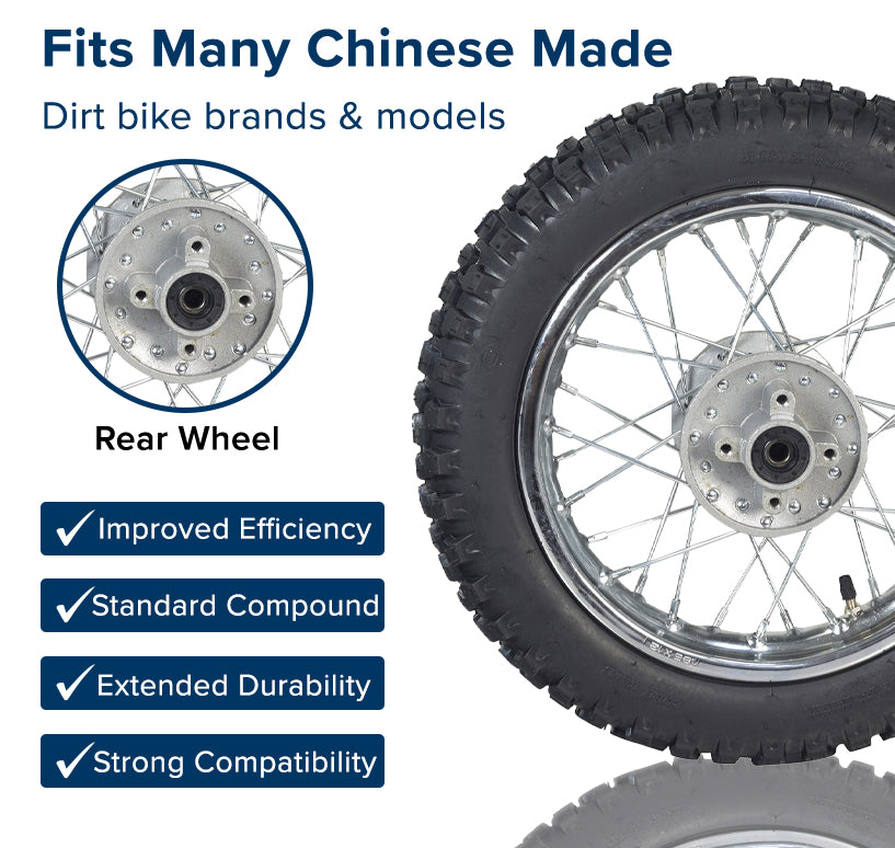 This rear wheel assembly is widely used on a number of Chinese-made dirt bike models from several brands. If your Chinese dirt bike rolls on a 12" rear rim and tire, chances are that this is the size that you want as a replacement wheel assembly.