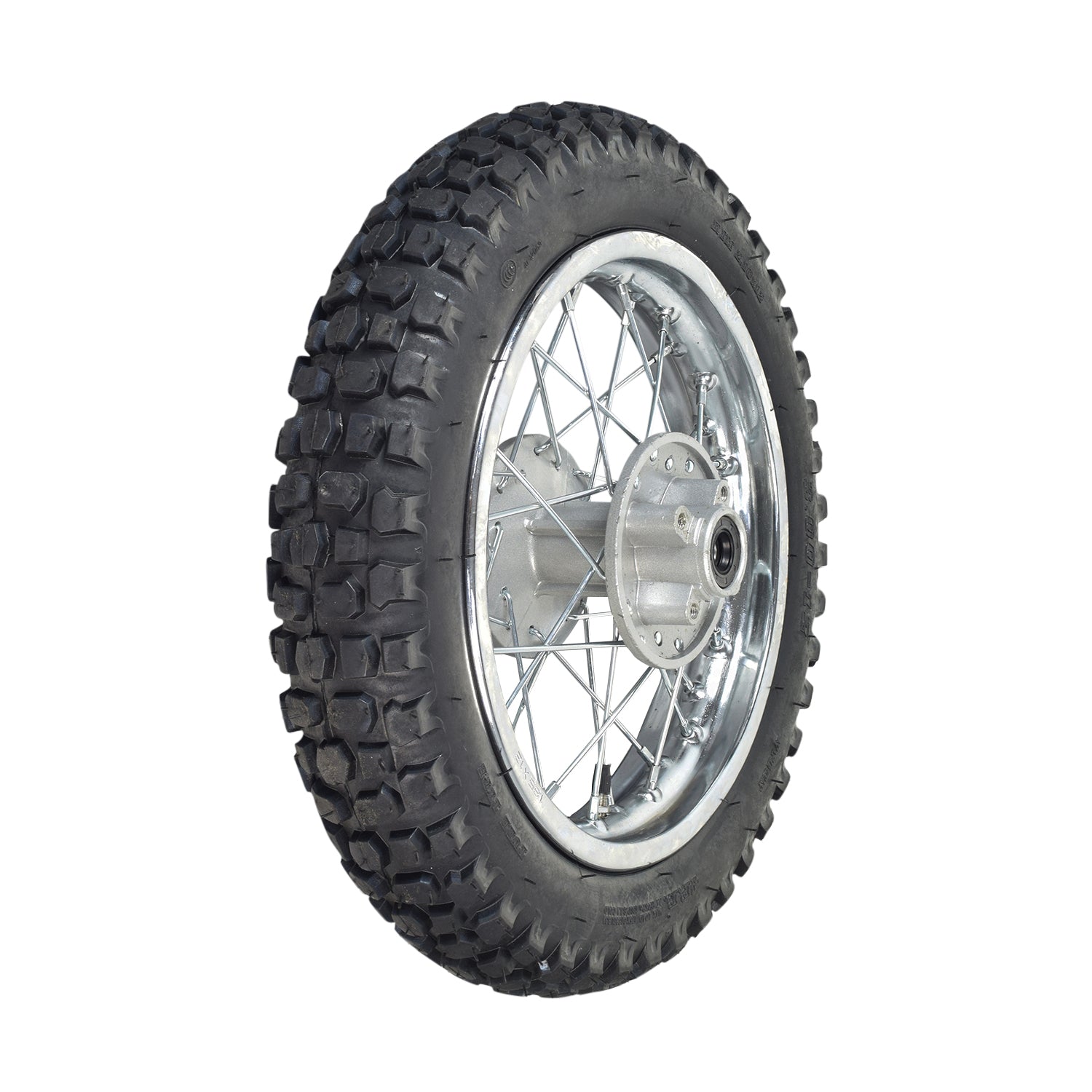 The 12" (3.00-12) Rear Rim Tire Wheel Assembly for Dirt Bikes (Version 1). This great little rear wheel assembly includes the 12" spoked rim, a 3.00-12 tire with a dirt-gripping knobby tread, inner tube, hub, and bearing.