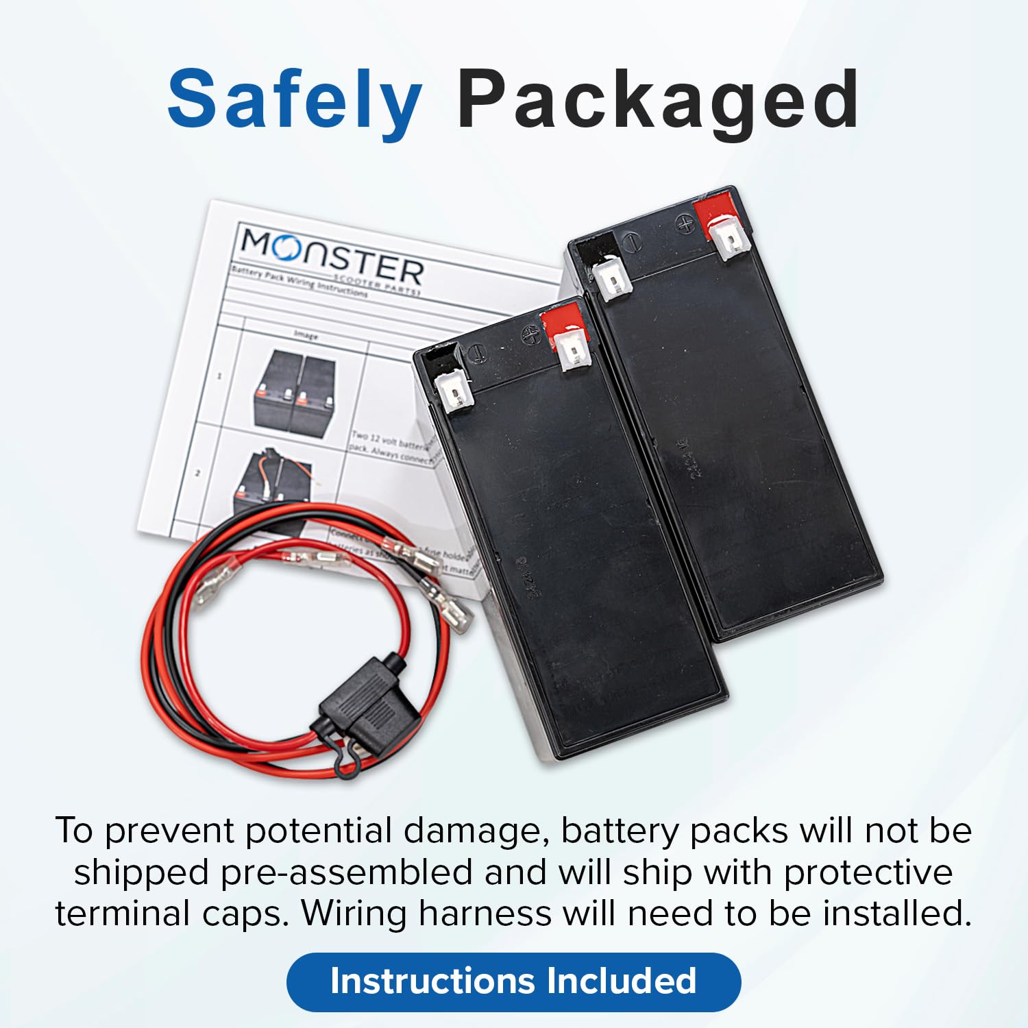 - Safely Packaged - To prevent damage, battery packs will not be shipped pre-assembled and will ship with protective terminal caps. Wiring harness will need to be installed. Instructions included
