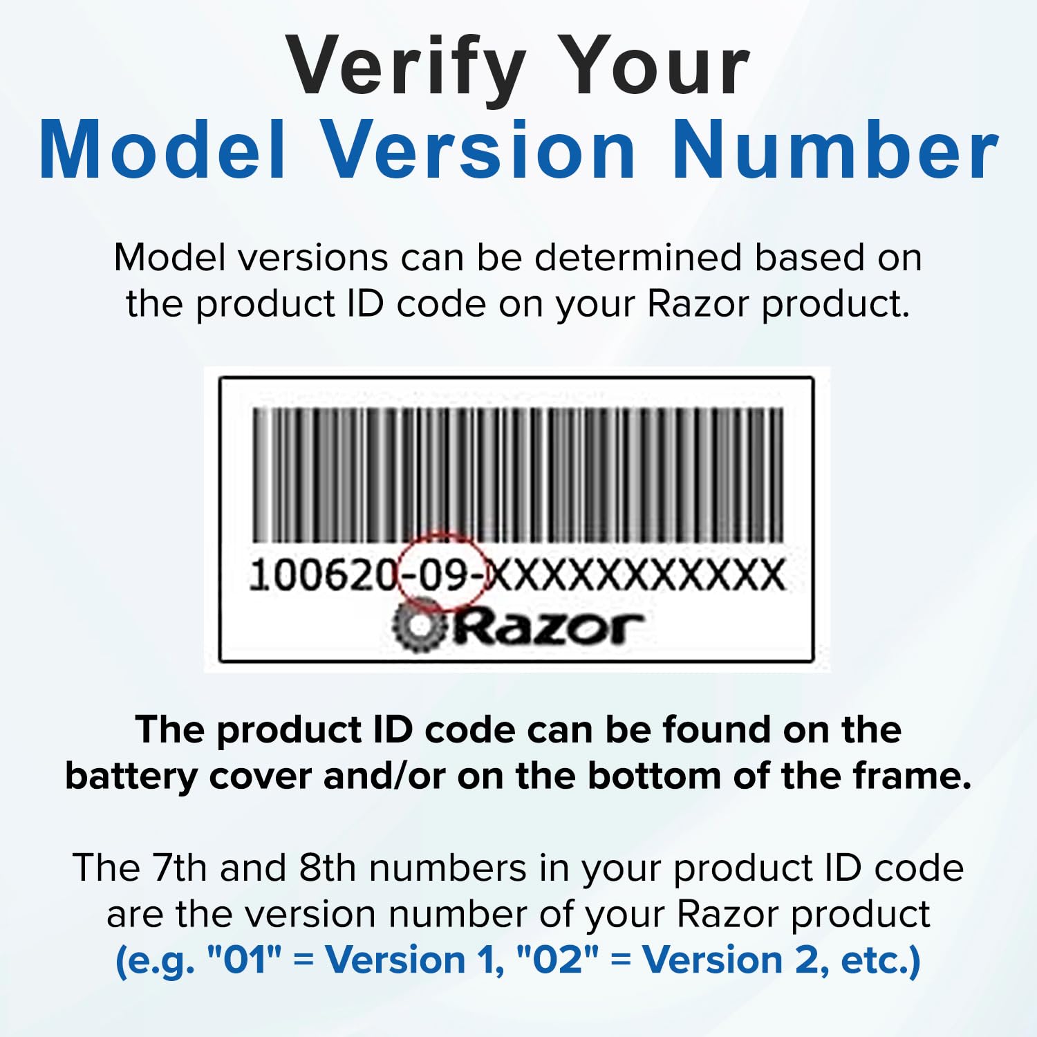 - Verify Model Version - Check your Razor 19-digit ID, the 7th and 8th numbers in your product ID code are the version number of your Razor product (e.g. "01" = V1, "09" = Version 9, etc.)