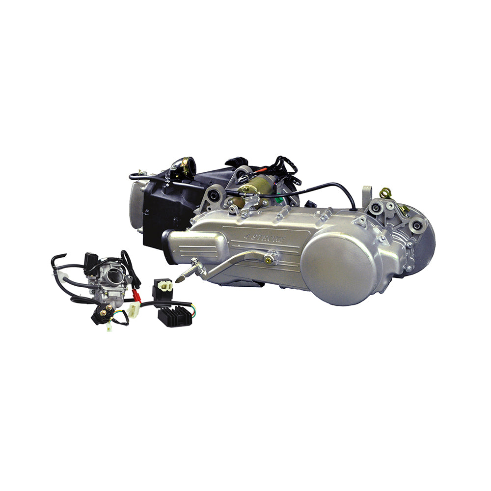 This is the 150cc long case 4-stroke GY6 157QMJ scooter engine with automatic CVT used on many of today's street-legal motor scooters. Our version is factory OEM for the Baccio VX 150 scooter. Unlike many of the generic or "house-brand" Chinese-made scooter models, Baccio scooters are known for their dependability, high quality, and value. These long case Baccio GY6 engines will work just fine on any number of modern scooters such as Roketa, SunL, Jonway, Tank, etc. This kit does include the Carburetor, Rectifier, Voltage Regulator, and CDI as pictured.