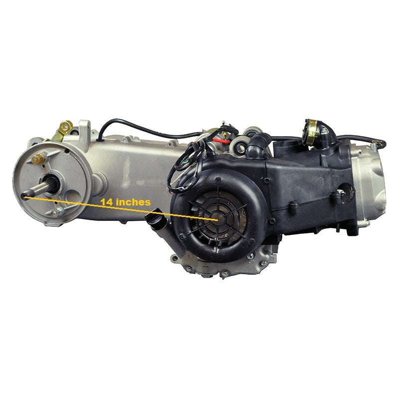 This is a long case GY6 engine, and was made specifically to power scooters with 12" and 13" rims. It will not work on scooters designed to use the short case engine or 10" wheels.