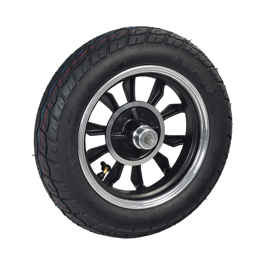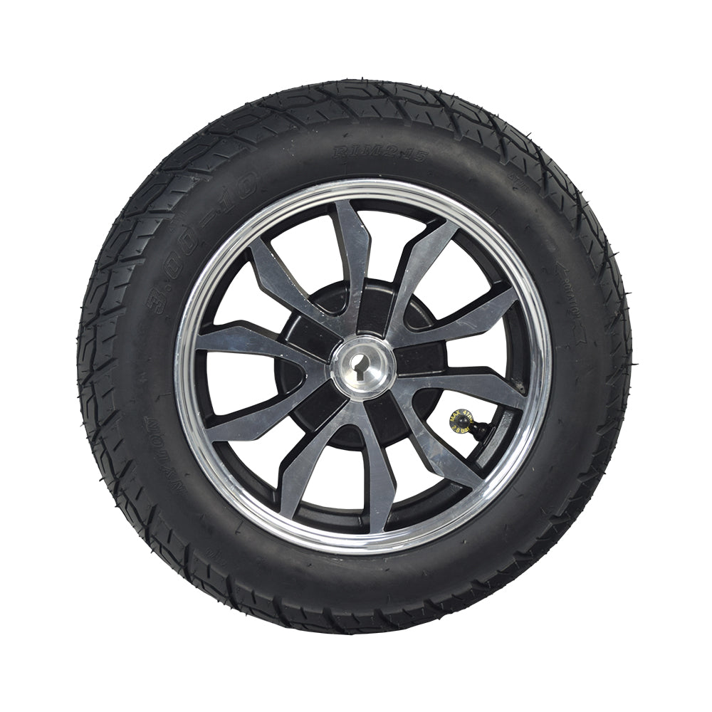 The 16" rear wheel assembly for the Pride Raptor (RS-1700) and Baja Raptor (BA300) mobility scooters looks more like it belongs on a street-legal motor scooter. With its big diameter rubber and street-style tread, this rear wheel assembly is as distinctive as the scooter for which it was designed.