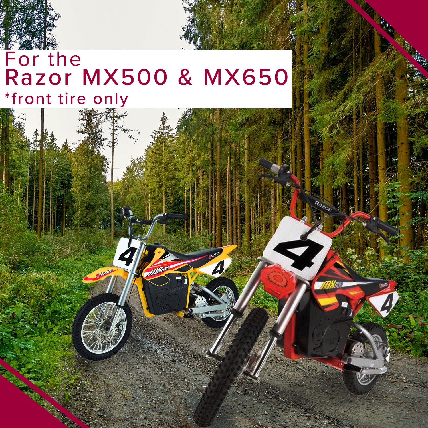 The Razor MX500 & MX650 front tire, size 16x2.4 (aka 64-305) is made by Qind, and it sports a Q204 Knobby tread. This tire is used on the front of the Razor MX500 and MX650 Dirt Rocket. This Razor MX500 tire and Razor MX650 tire is a compatible replacement part that meets or exceeds the original tire from Razor.