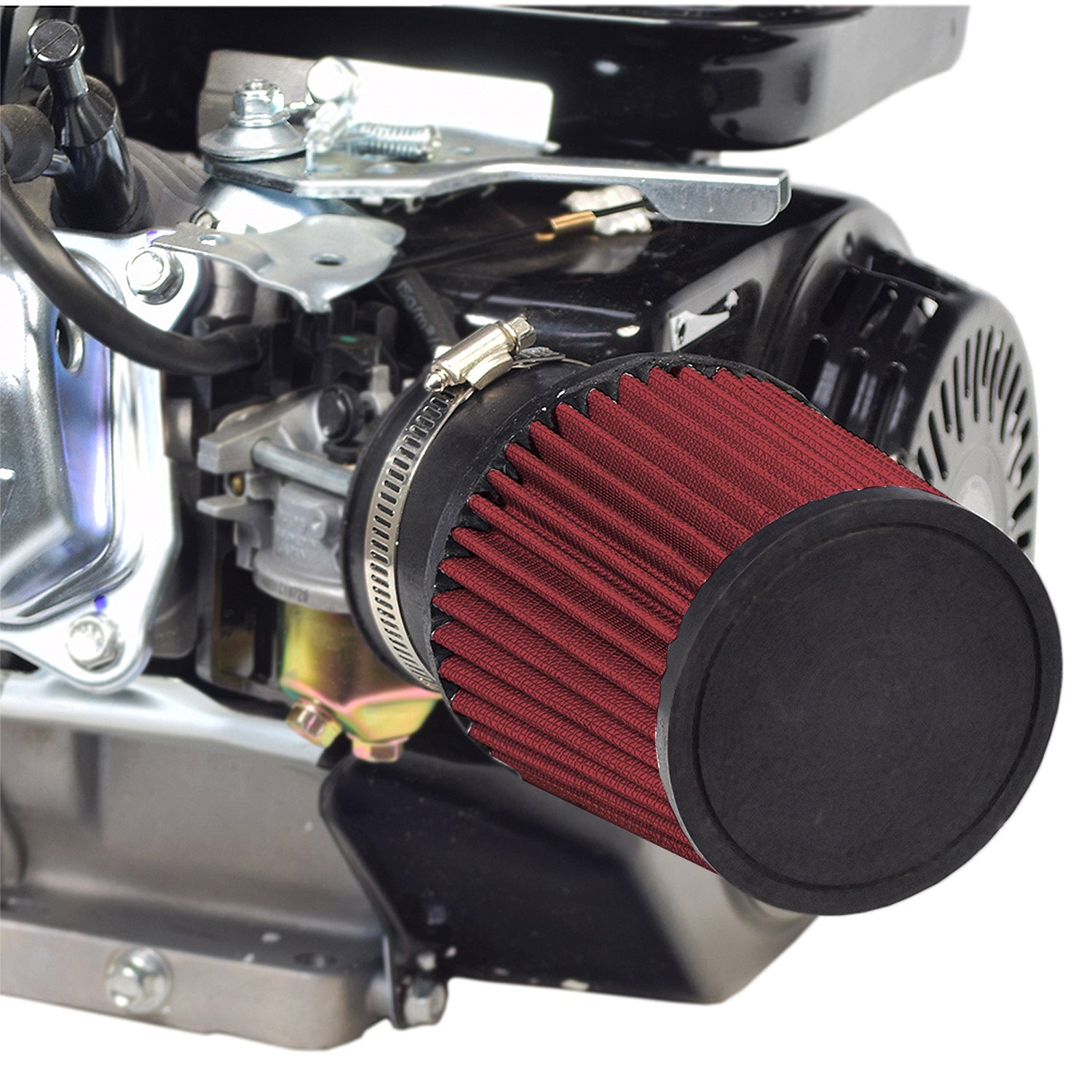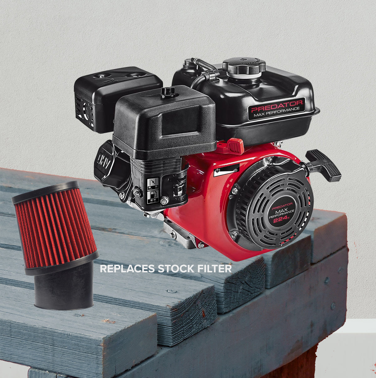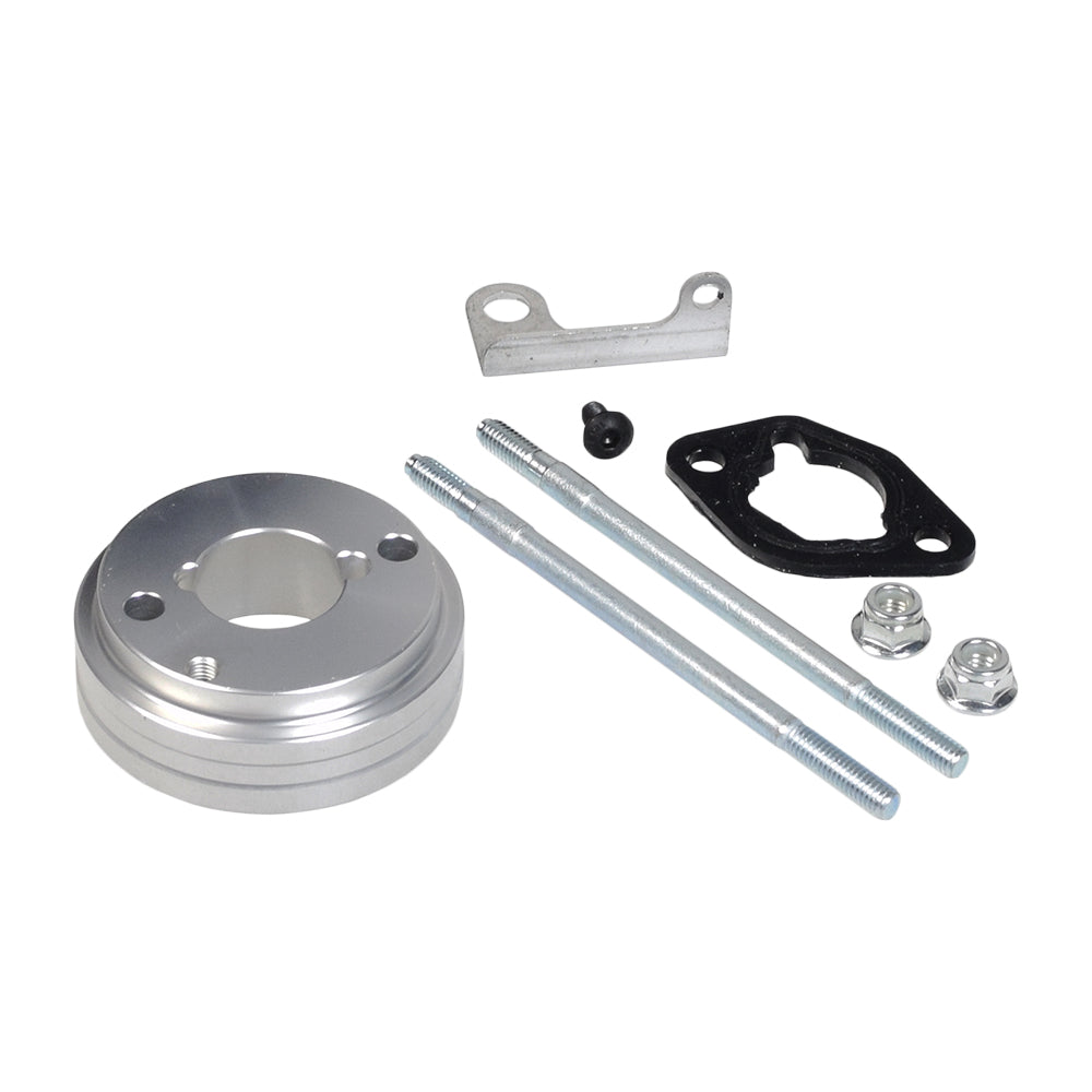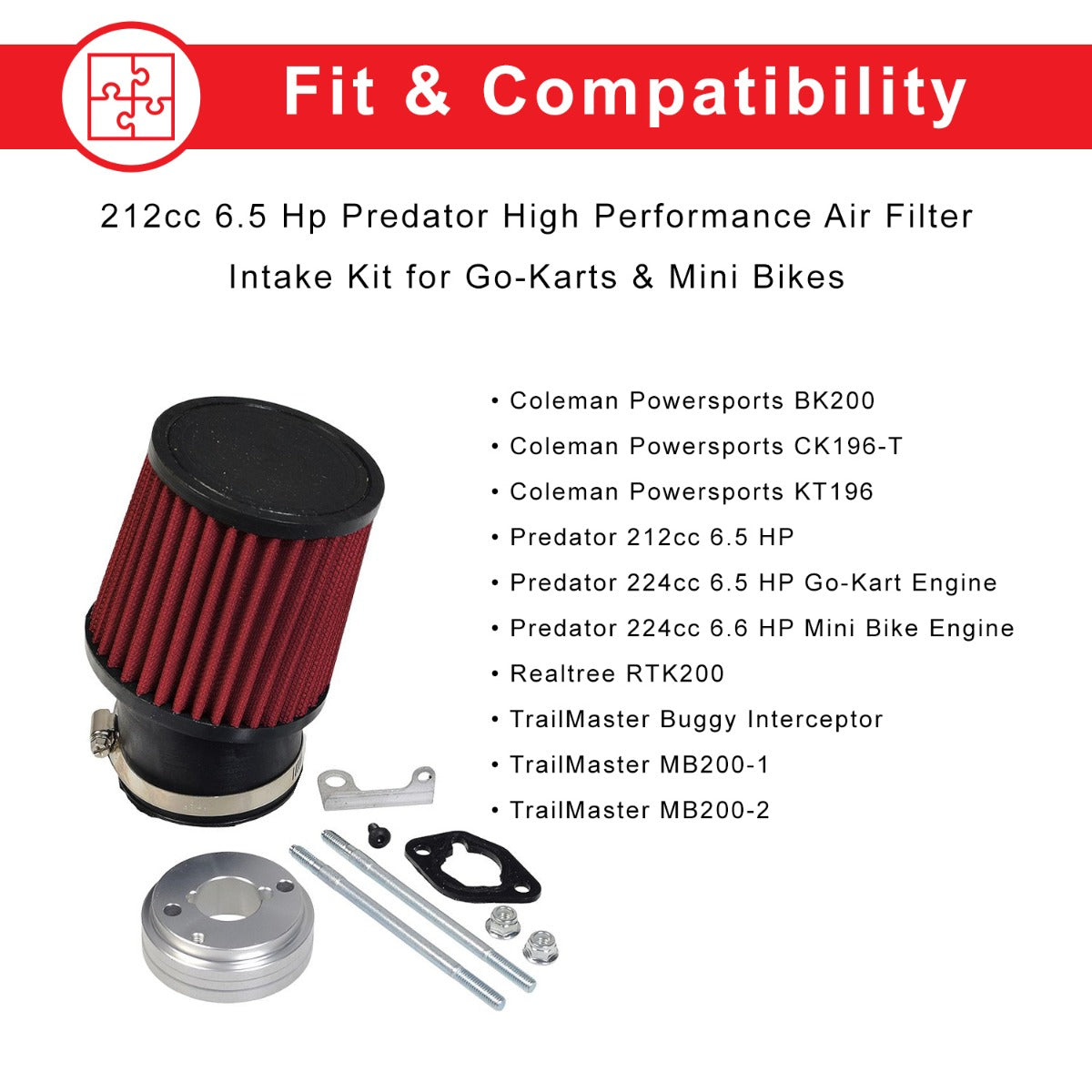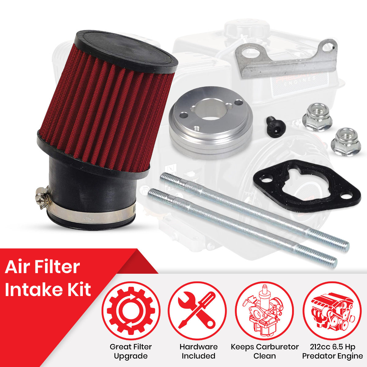 Upgrade your big engine with our 212cc 6.5 HP and 224cc 6.6 HP Predator high-performance air filter Intake kit for go-karts and mini bikes. It's a quick and easy job to upgrade your engine's air filter. Larger displacement gas powersports engines need larger volumes of clean dust-free air into the carburetor in order to produce the horsepower that you want when on the track or trail. This big filter does a superlative job in keeping the dust and crud out of your carb, resulting in better horsepower and smoother running. This kit includes the filter, stack, gasket, filter-to-carburetor mounting stud, adapter, bracket, hose clamp, and hardware.