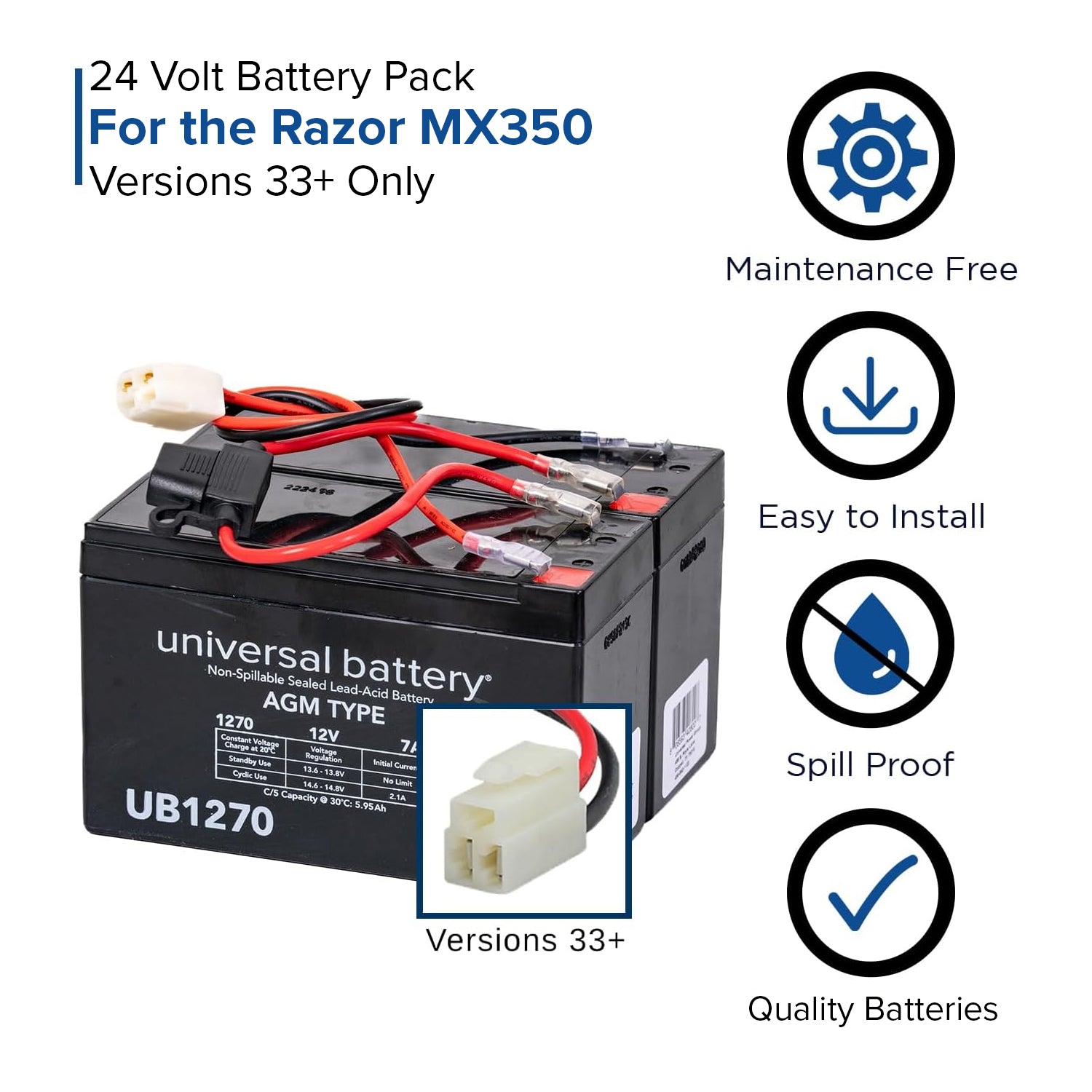 If you have a later Razor MX350 Dirt Rocket (versions 9+) then we have a deal for you. Our OEM equivalent 24 volt battery pack for the Razor MX350 (versions 9+) is an unbeatable value in electric scooter and bike batteries that will definitely save you some money. For one low price we will send you two new high quality 12 Volt 7 Ah batteries. Or you can upgrade your battery pack with a pair of high capacity 12 Volt 9 Ah batteries that will give you an increased runtime of up to 28%. The choice is your's to make.