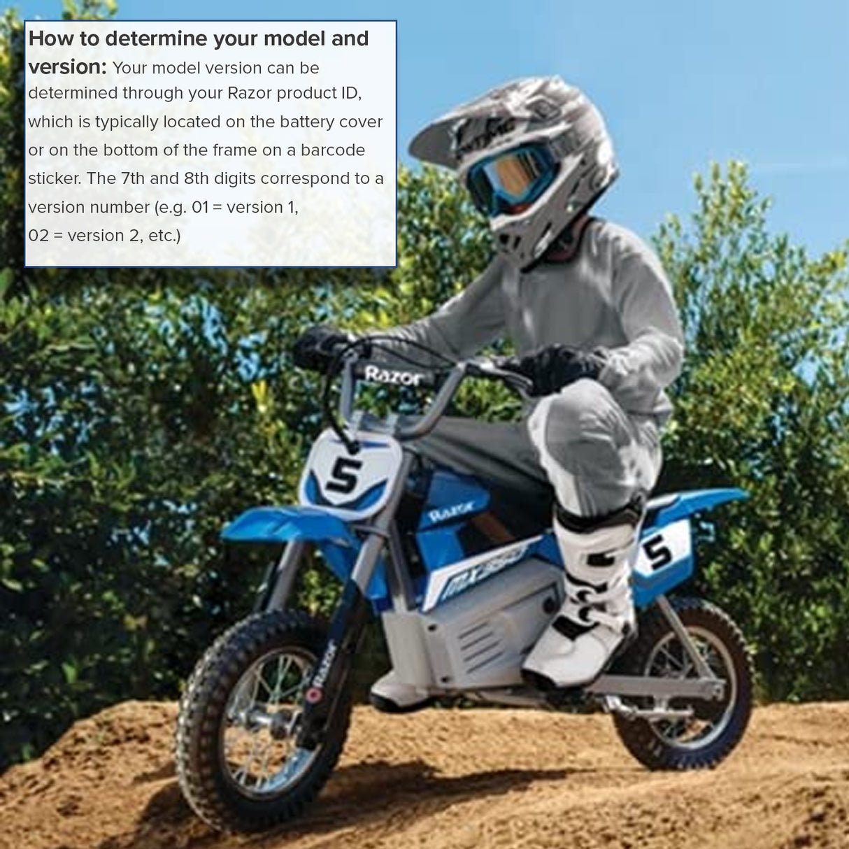 In addition; your model version can be determined through your Razor product ID, which is typically located on the battery cover or on the bottom of the frame on a barcode sticker. The 7th and 8th digits correspond to a version number (e.g. 01 = version 1, 02 = version 2, etc.).
