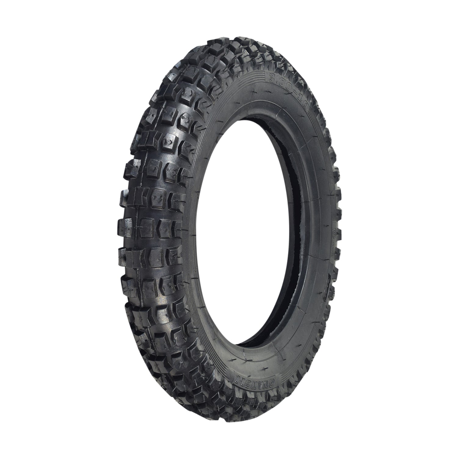 3.00-10 knobby tread dirt bike tire typically used on mini dirt bikes of engine size 49cc/50cc & 70cc. This size tire is found on several models from Coolster, and can be used as an alternative to the more narrow width size of 2.50-10 found on many Baja Motorsports, Honda, & Yamaha models.