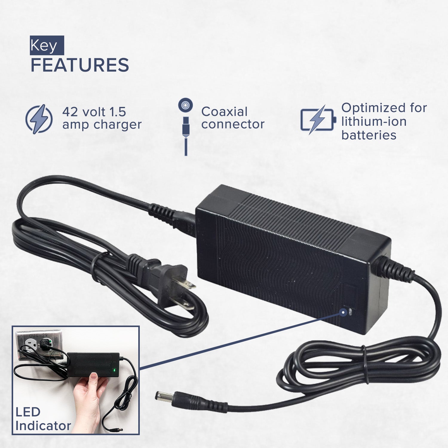 - Durable 42 Volt Charger: Our 42 Volt coaxial lithium battery charger is built to last, providing a steady 1.5 amp charging output and reliable performance to keep your electric scooter powered up