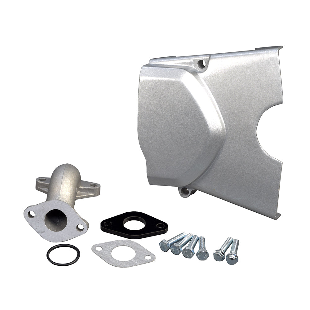 An elbow-shaped carburetor joint (or intake manifold extension) is included with this engine. Depending on your vehicle type, this cast & machined "pipe" holds the carburetor at the proper angle and away from the engine head. Although the exhaust port with the two pre-installed mounting studs uses the same hole-spacing as the intake, this intake manifold extension does not work for the exhaust due to the cut-out on the exhaust port.