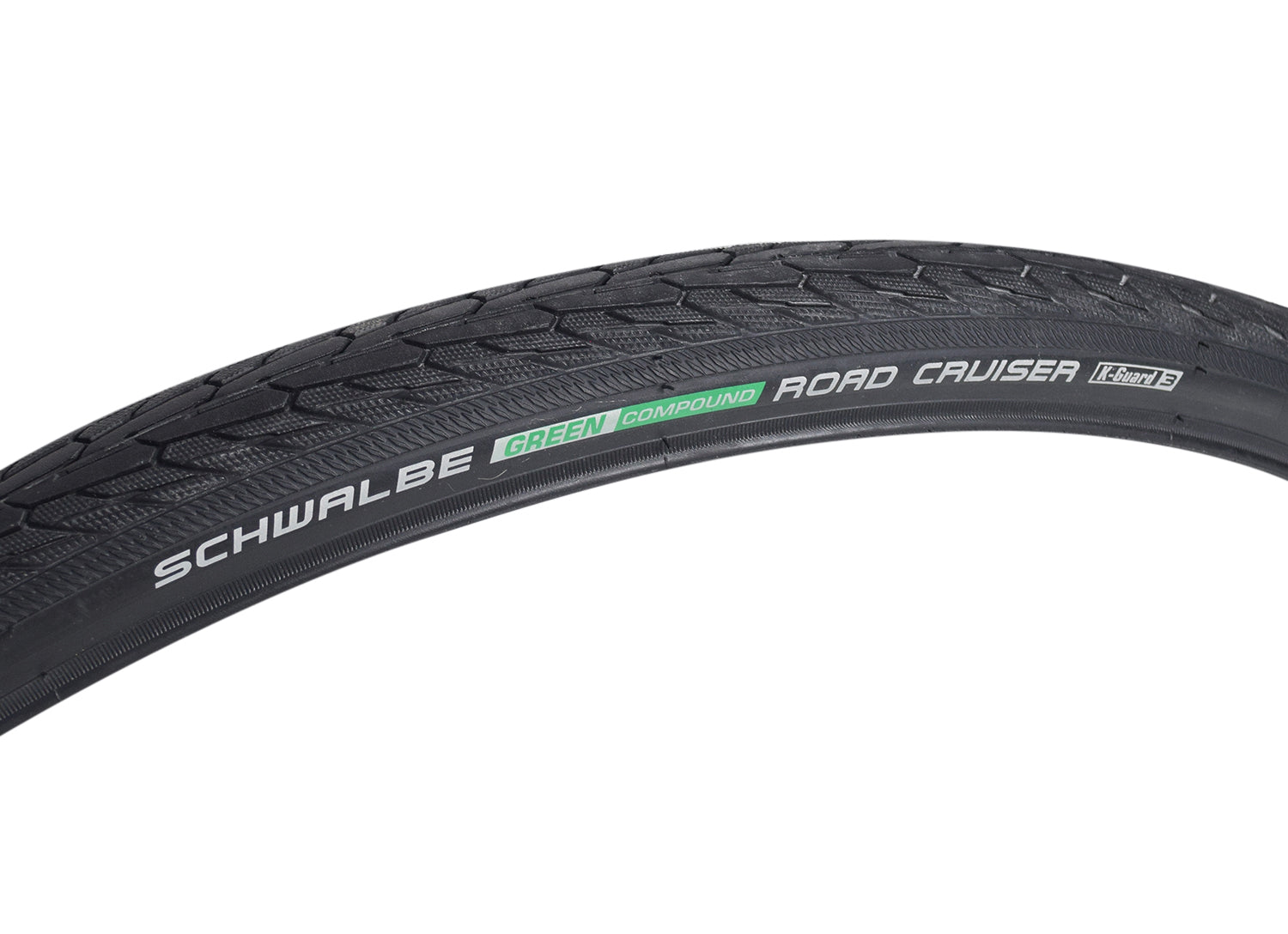 Directional tread with smooth center section and micro-knurled shoulders for a quiet running tire with low rolling resistance perfect for road and trekking use. K-Guard belted offers entry level puncture protection against thorns and road debris. Green compound is made from renewable and recycled raw materials. Twin Skin - An additional rubber coating on the side protects against cuts and allows for uniform coloring. KGRD - Layer from natural rubber, reinforced with Kevlar« fibres. The protection standard for every tire from the Active Line. REF - Reflective sidewall striping or hotpatch to aid in low light visibility.